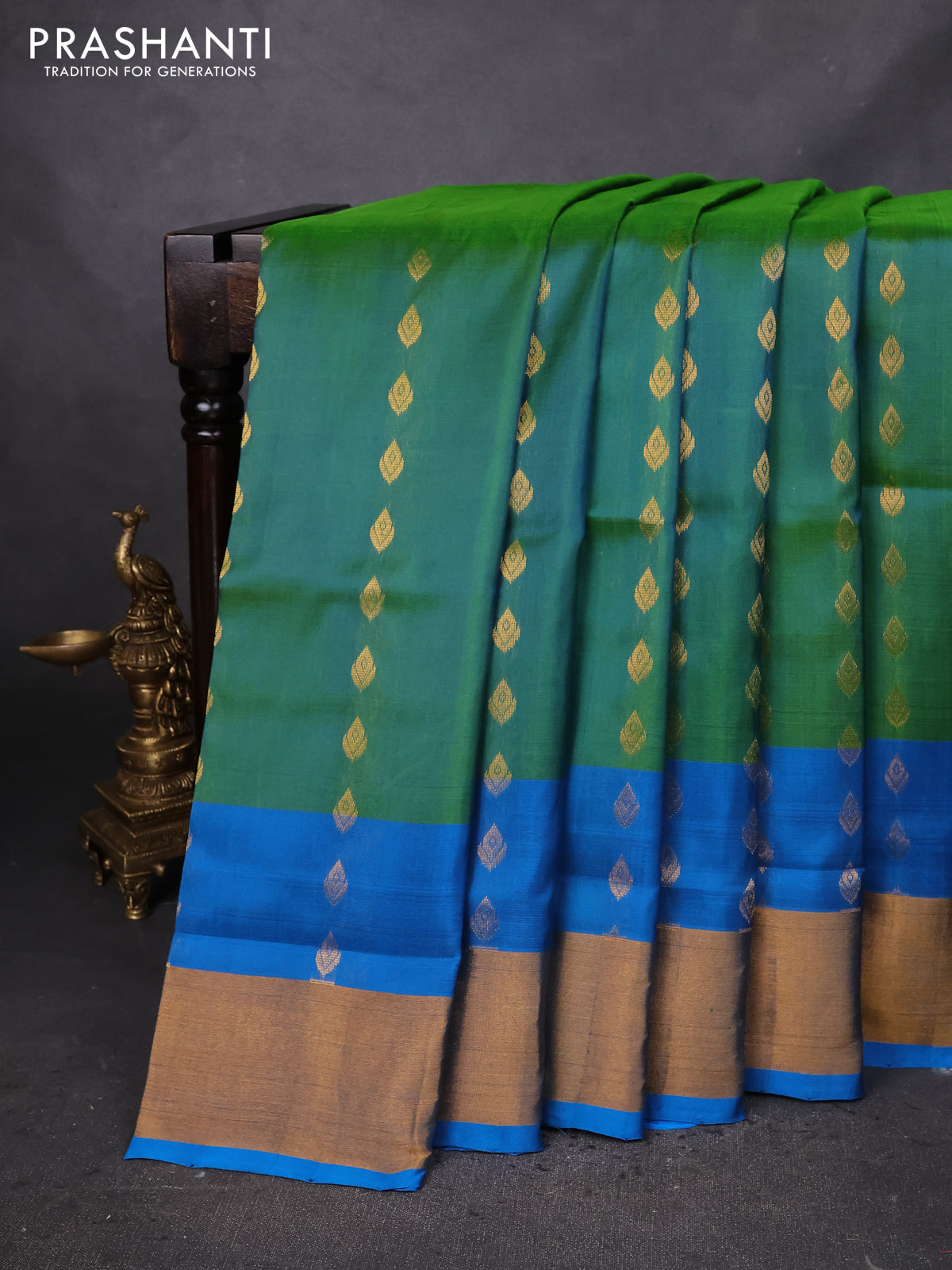 Pure uppada silk saree dual shade of green and cs blue with allover zari woven buttas and zari woven border