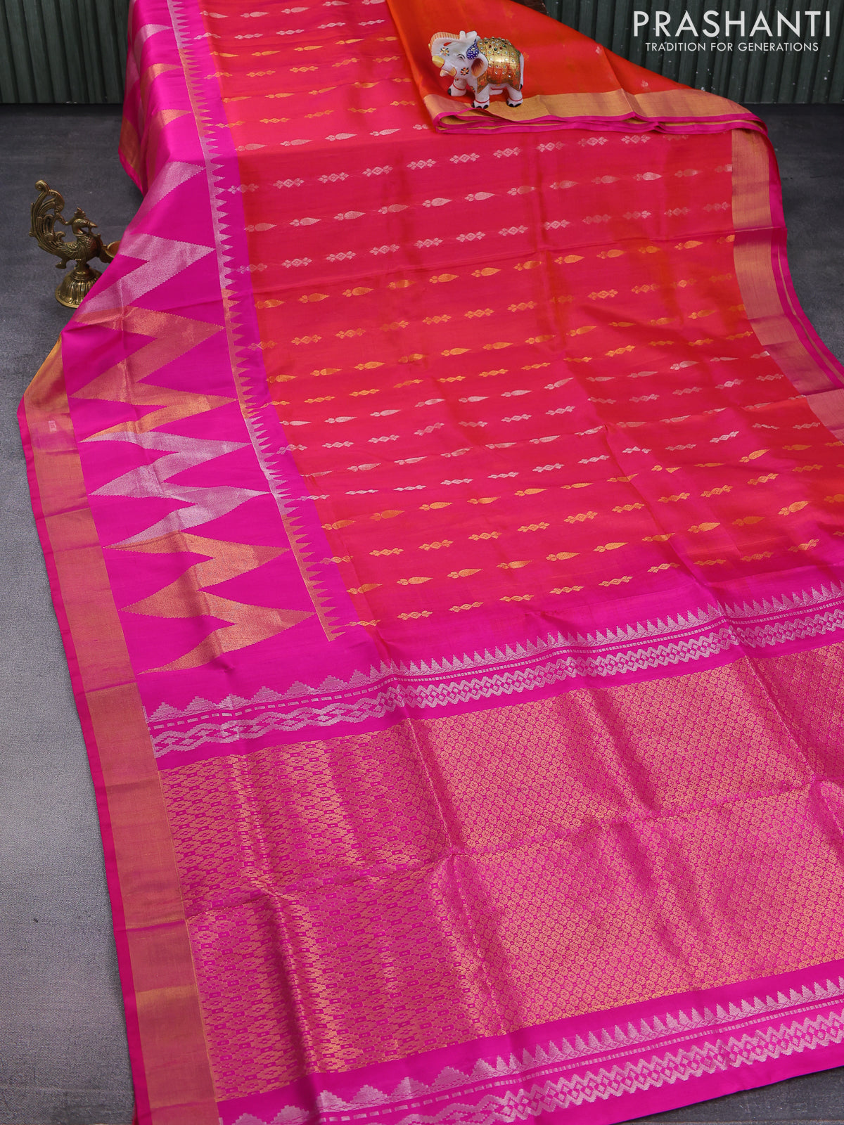 Pure uppada silk saree dual shade of pinkish orange and pink with silver & gold zari woven buttas and long zari woven butta border
