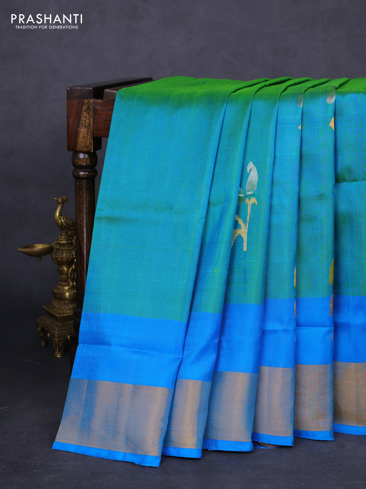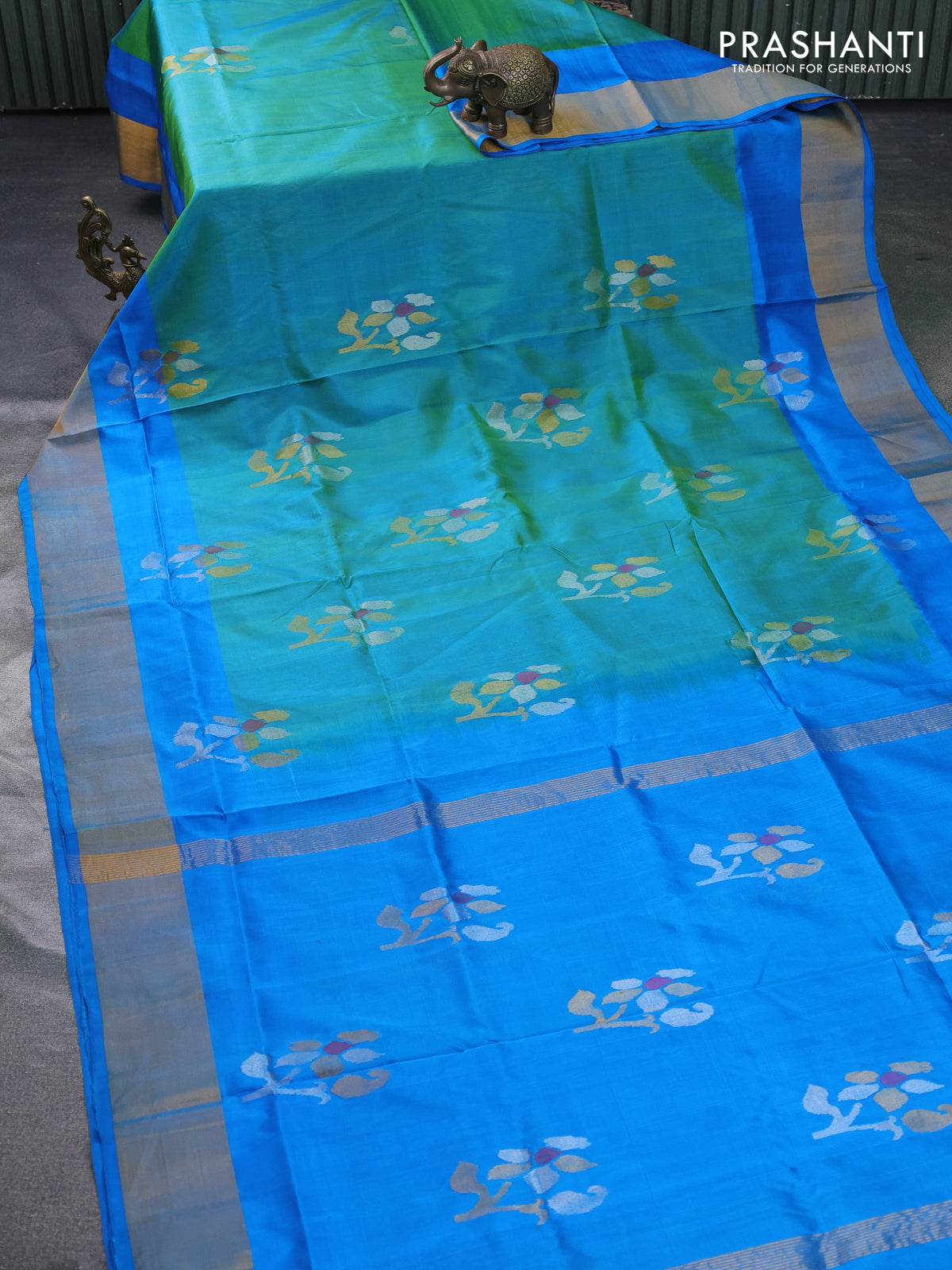 Pure uppada silk saree dual shade of teal bluish green and cs blue with jamdhani zari woven buttas and zari woven border