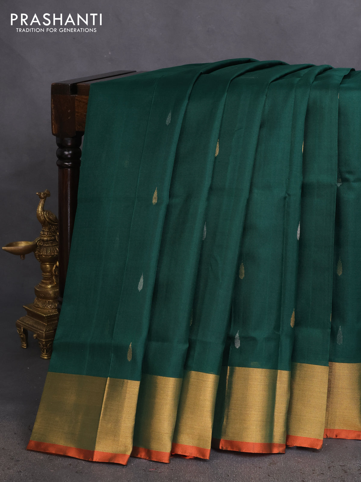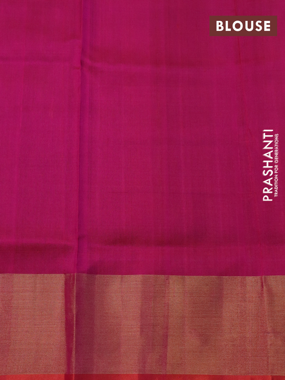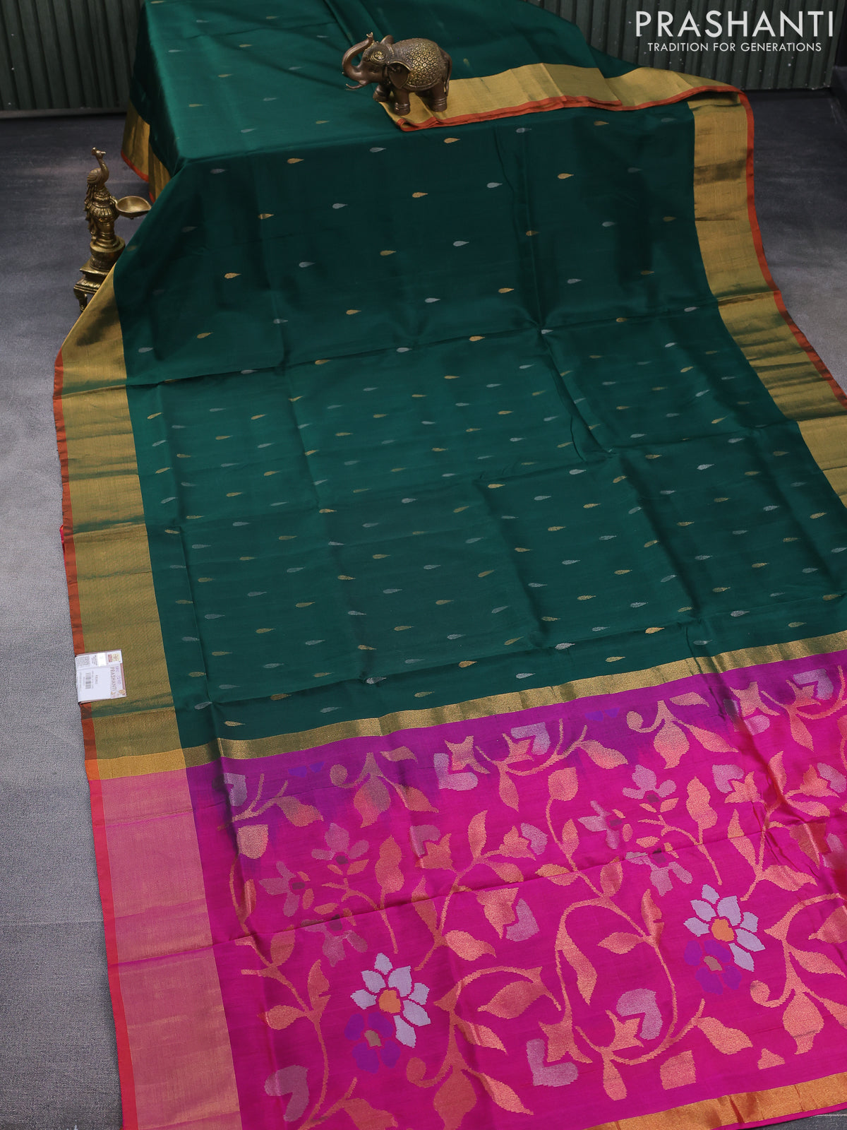 Pure uppada silk saree green and dual shade of pink with silver & gold zari woven tilak buttas and jamdhani design pallu