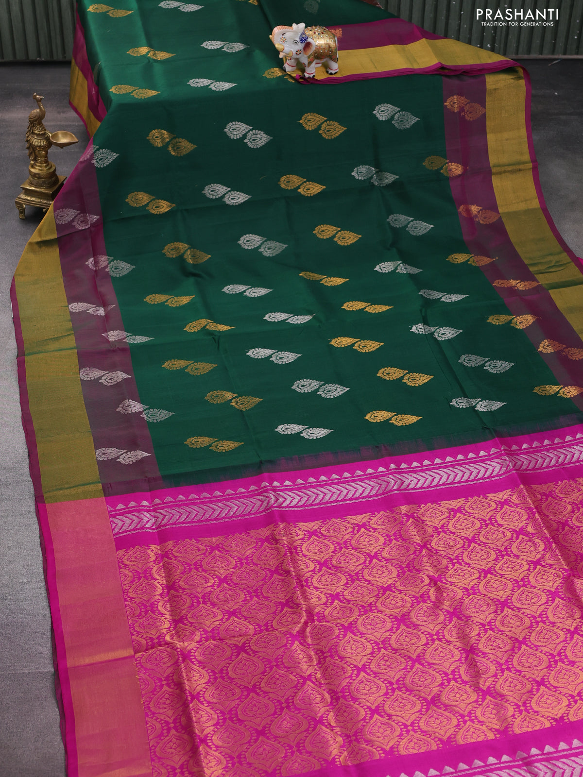 Pure uppada silk saree green and pink with silver & gold zari woven buttas and zari woven border