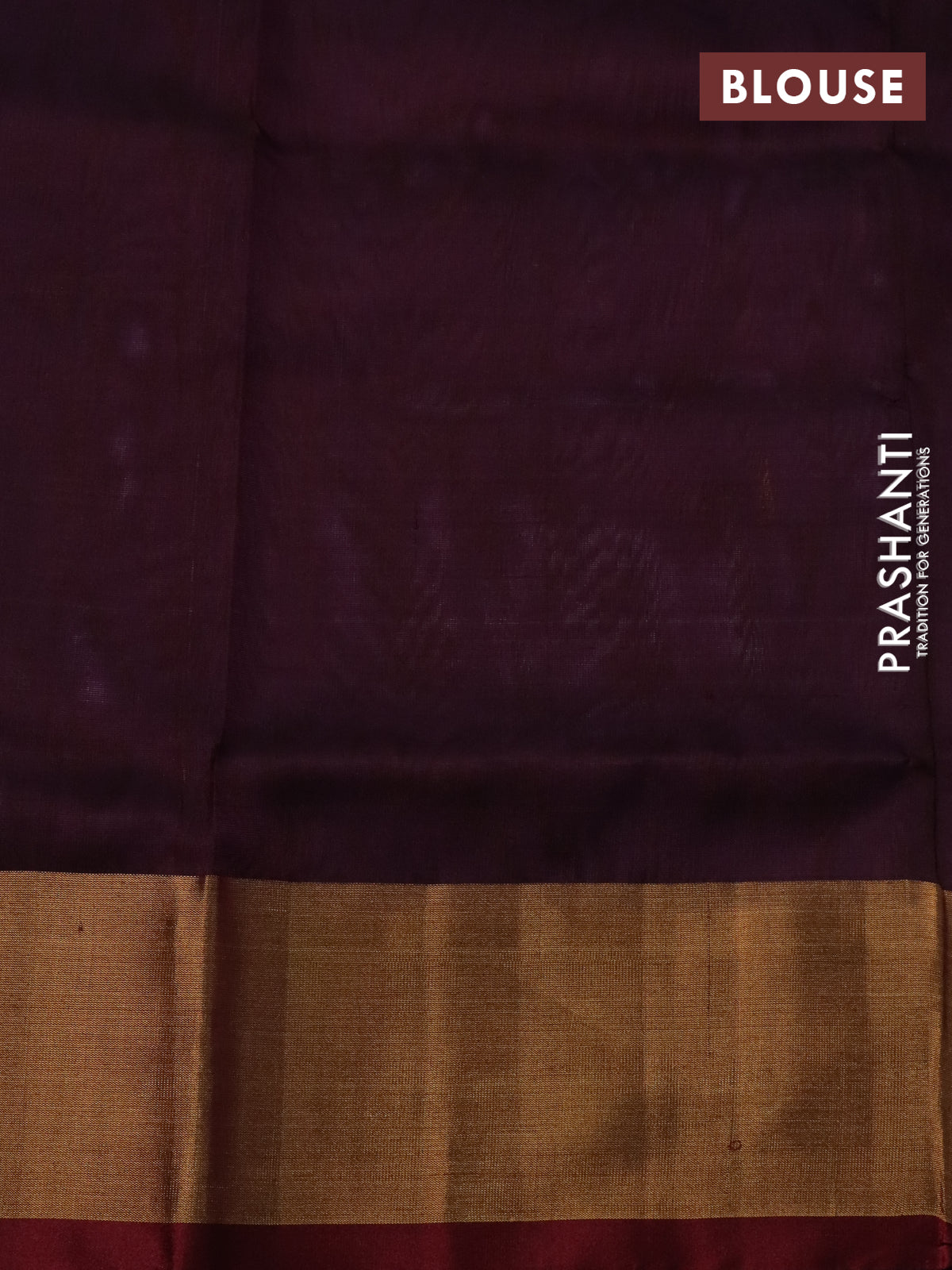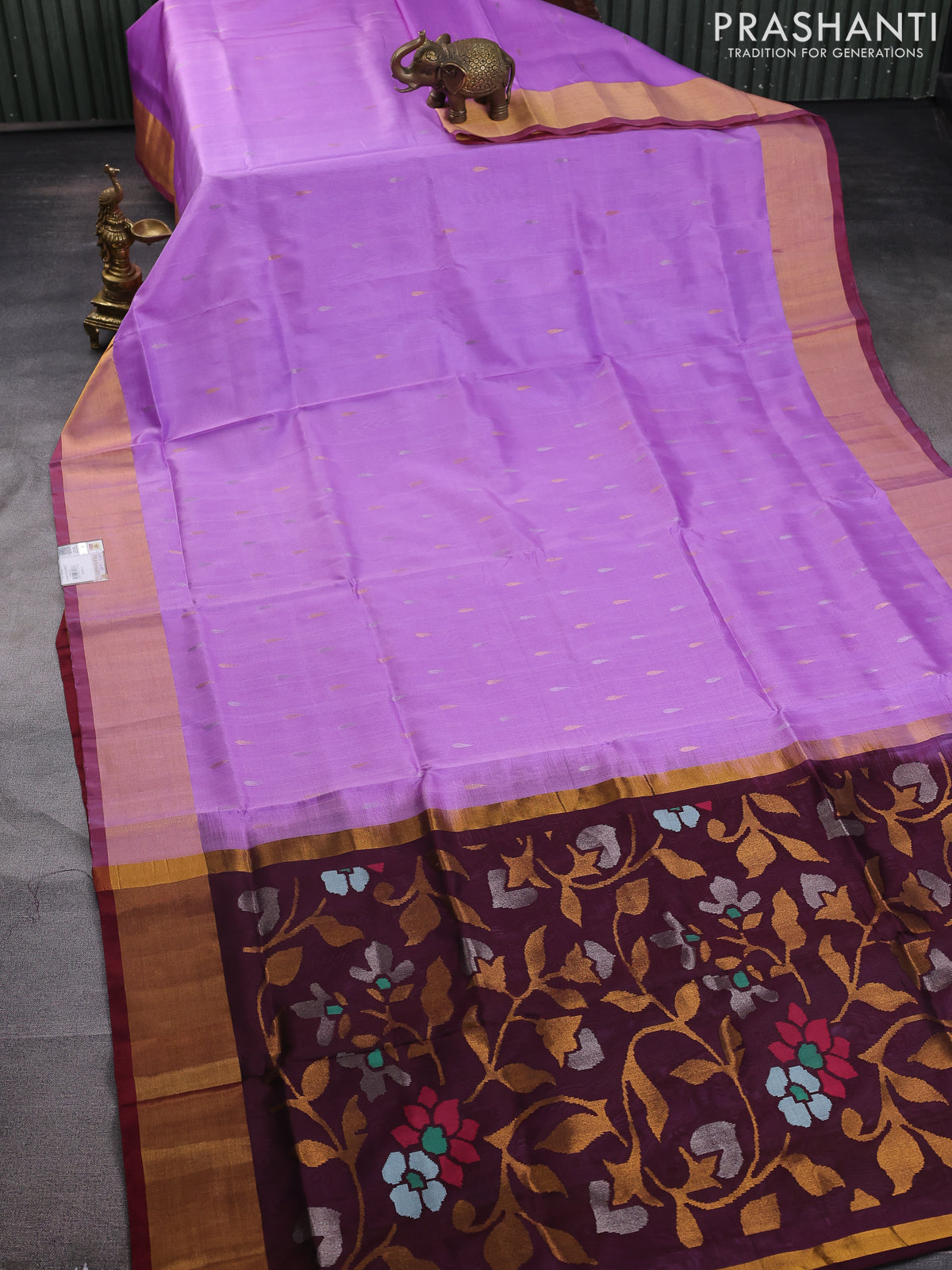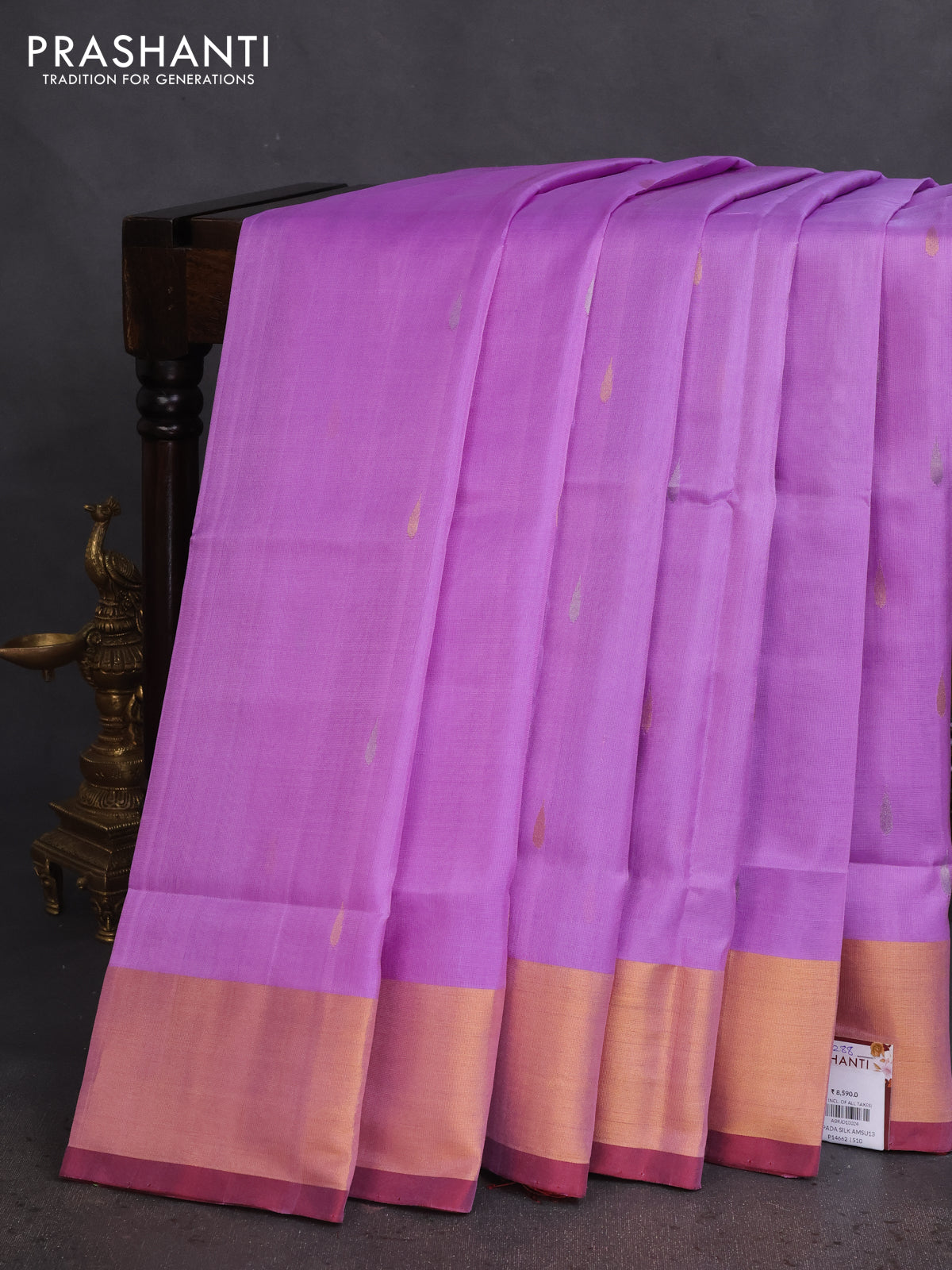 Pure uppada silk saree lavender and brown with silver & gold zari woven tilak buttas and jamdhani design pallu