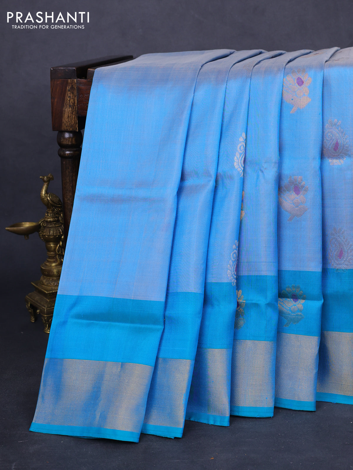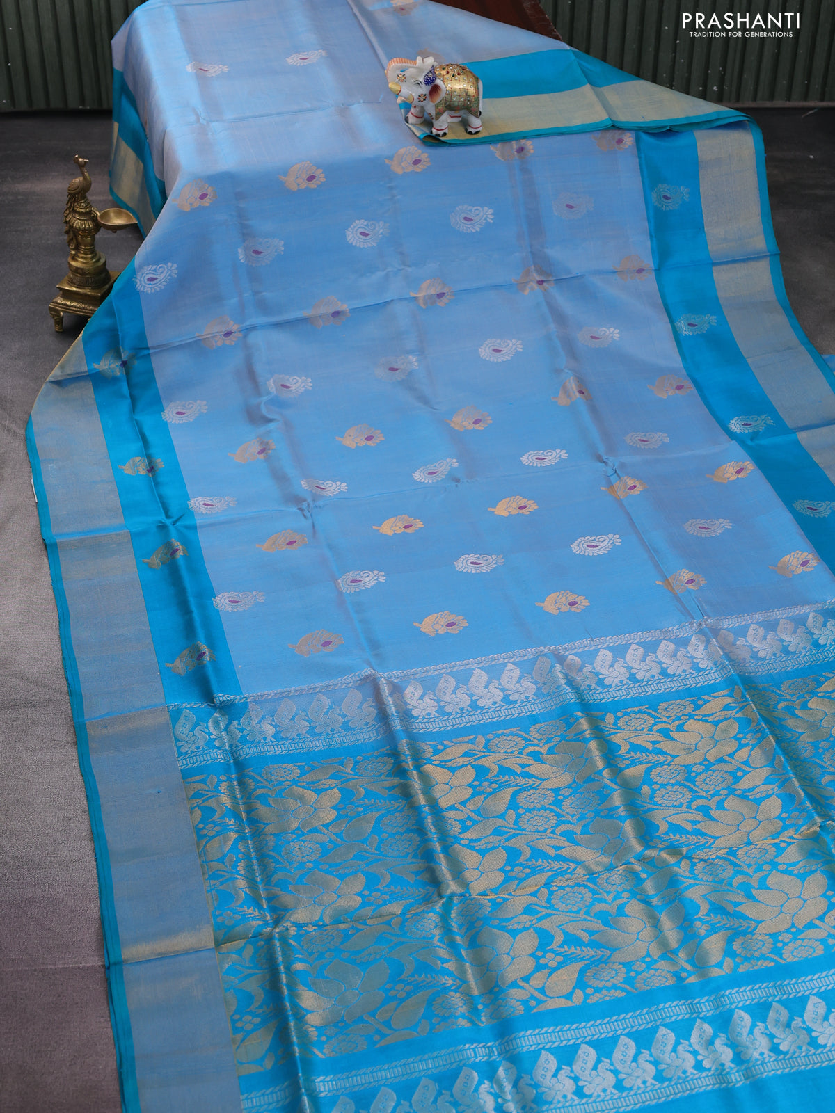 Pure uppada silk saree pastel blue and teal blue with silver & gold zari woven buttas and zari woven border