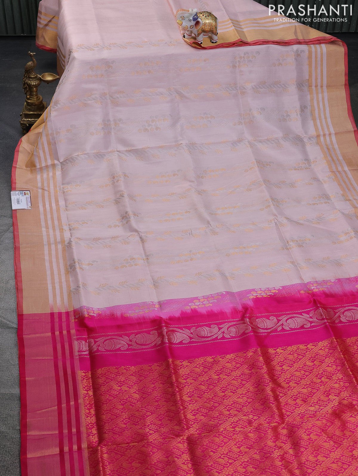 Pure uppada silk saree pastel peach and pink with allover silver & gold zari weaves and zari woven border
