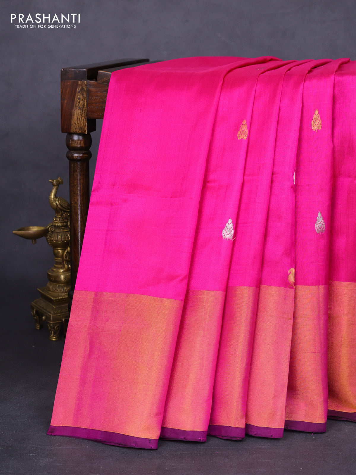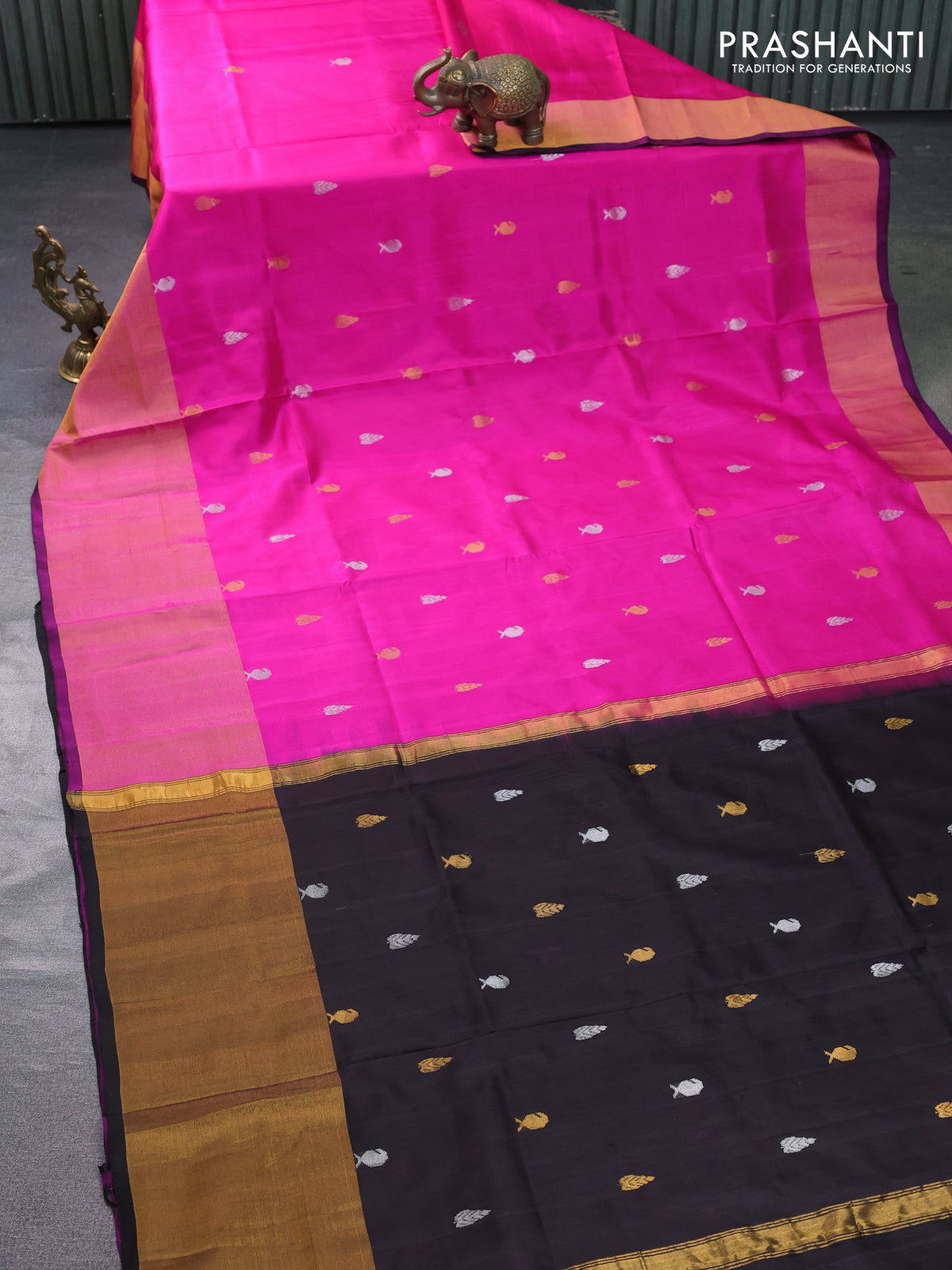 Pure uppada silk saree pink and black with silver & gold zari woven buttas and long zari woven border