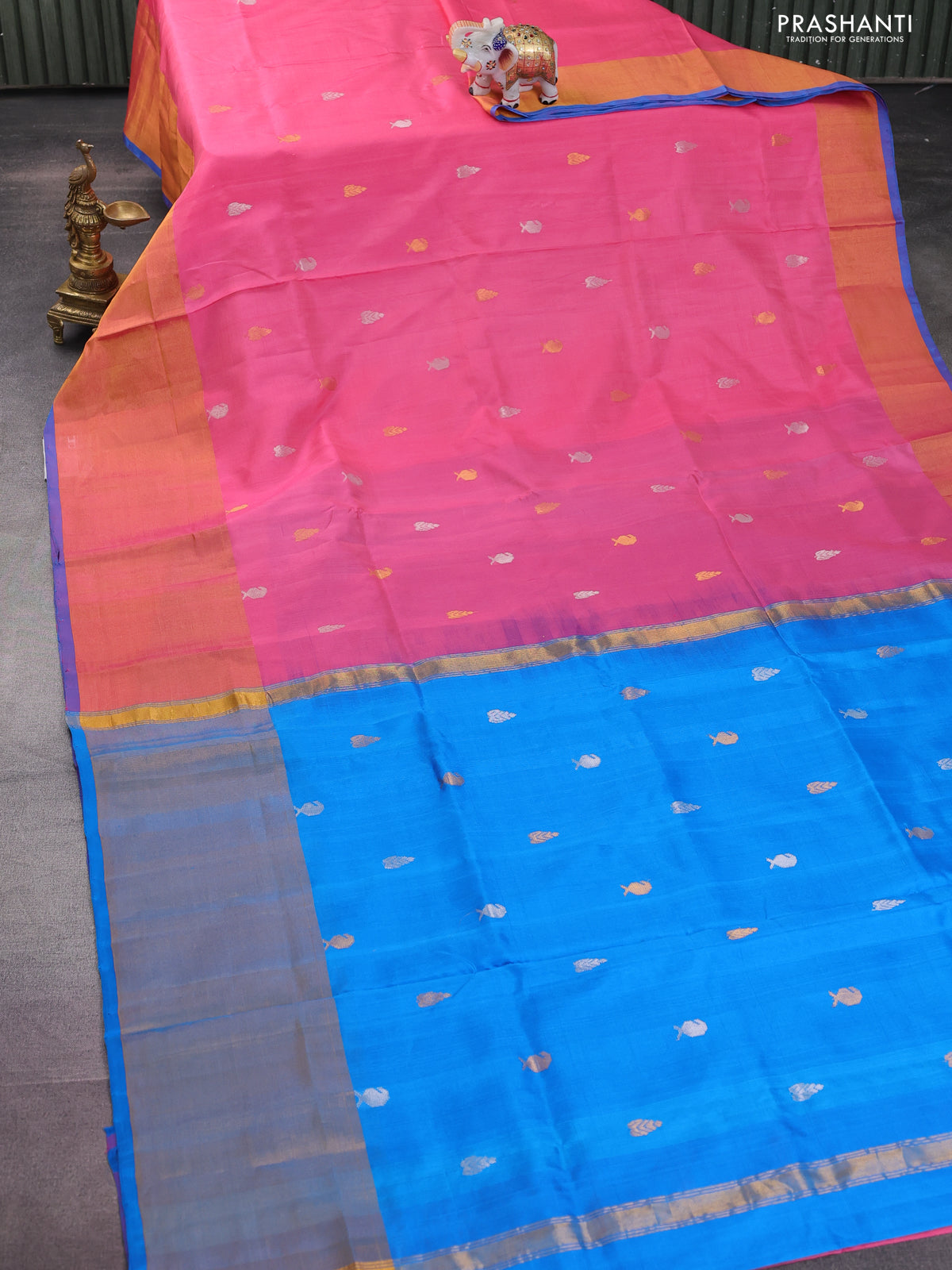 Pure uppada silk saree pink and cs blue with silver & gold zari woven buttas and long zari woven border