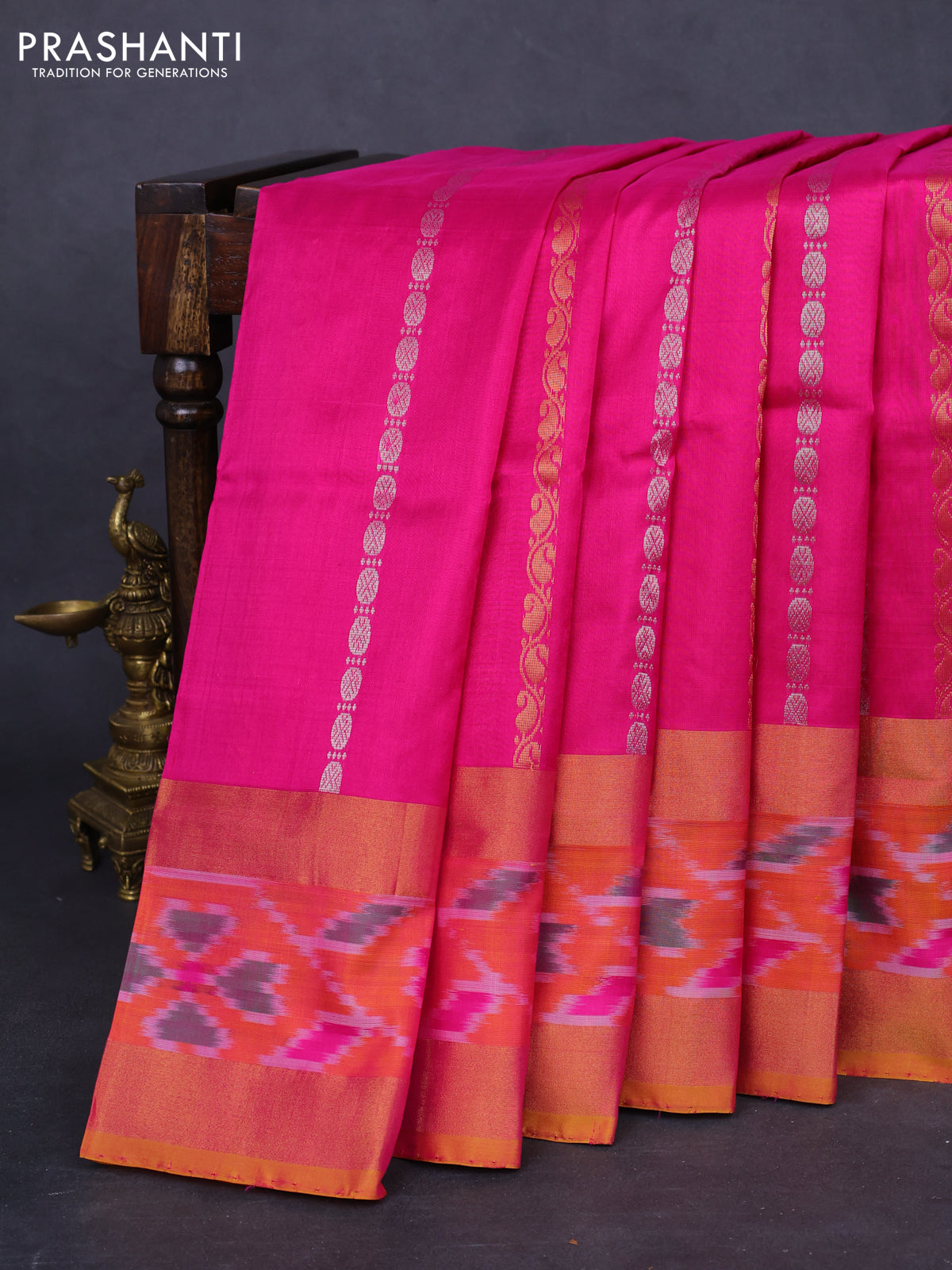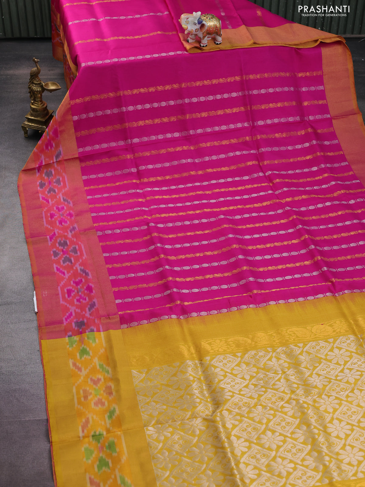 Pure uppada silk saree pink and mustard yellow with allover silver & gold zari weaves and zari woven ikat style border