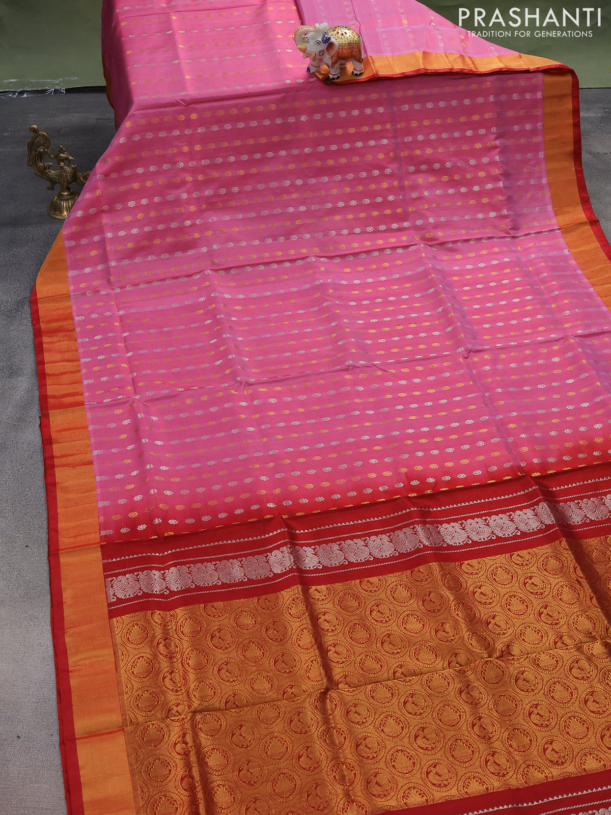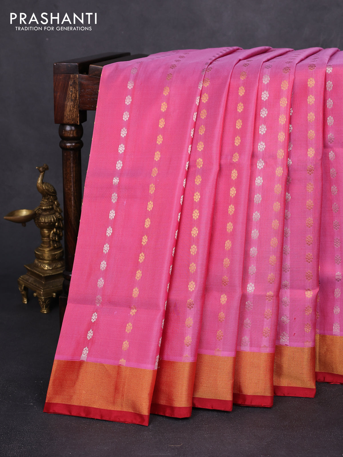 Pure uppada silk saree pink shade and maroon with allover silver & gold zari woven butta weaves and zari woven border