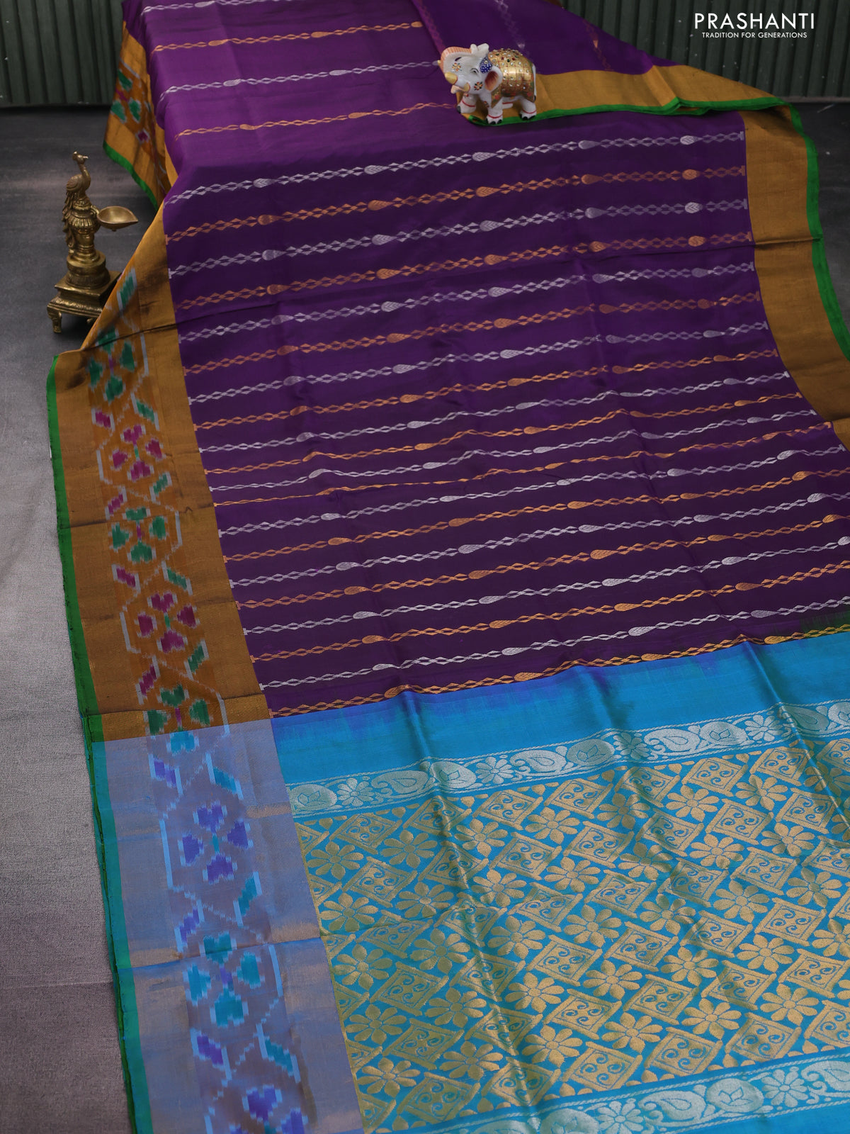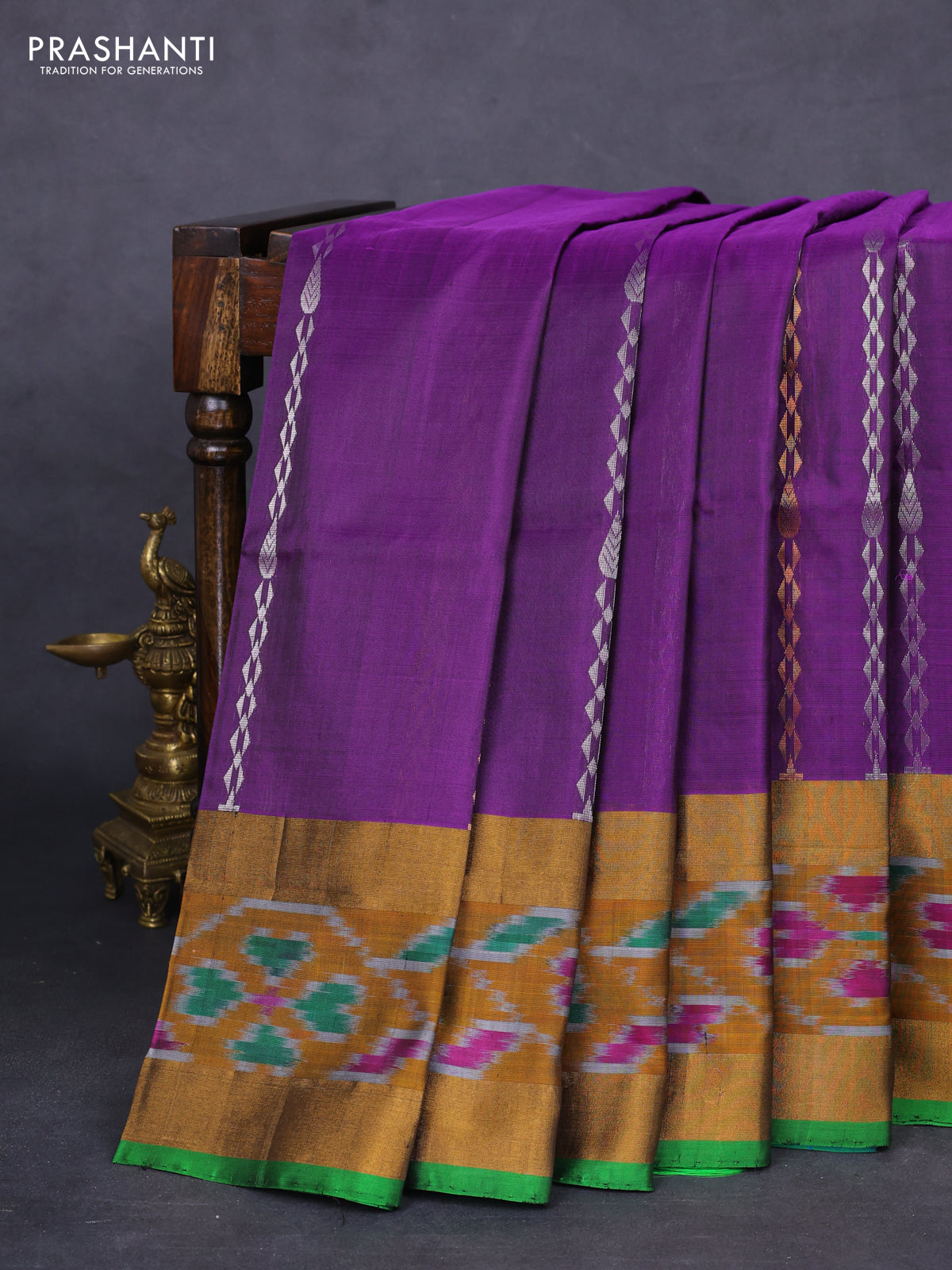 Pure uppada silk saree purple and green with allover silver & gold zari weaves and zari woven ikat style border