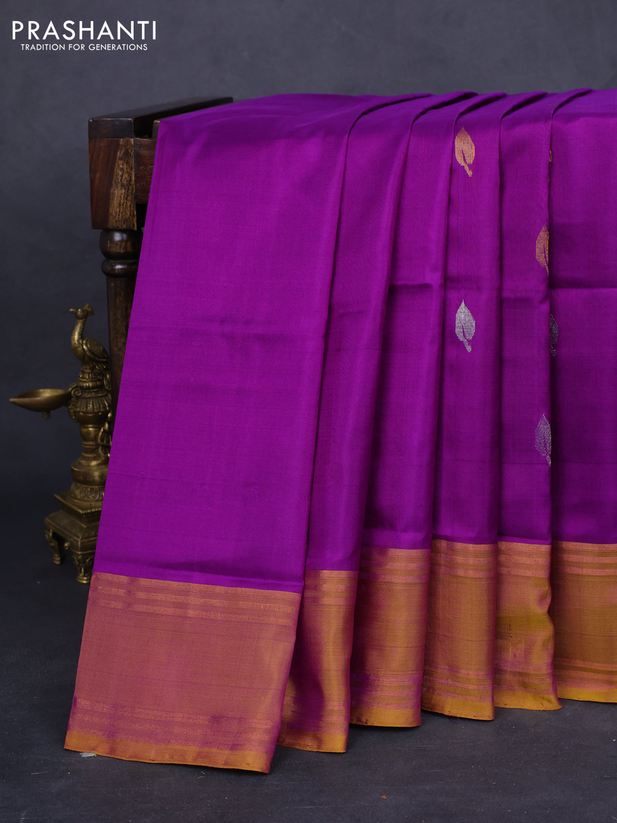 Pure uppada silk saree purple and mustard shade with silver & gold leaf zari buttas and rettapet zari woven border