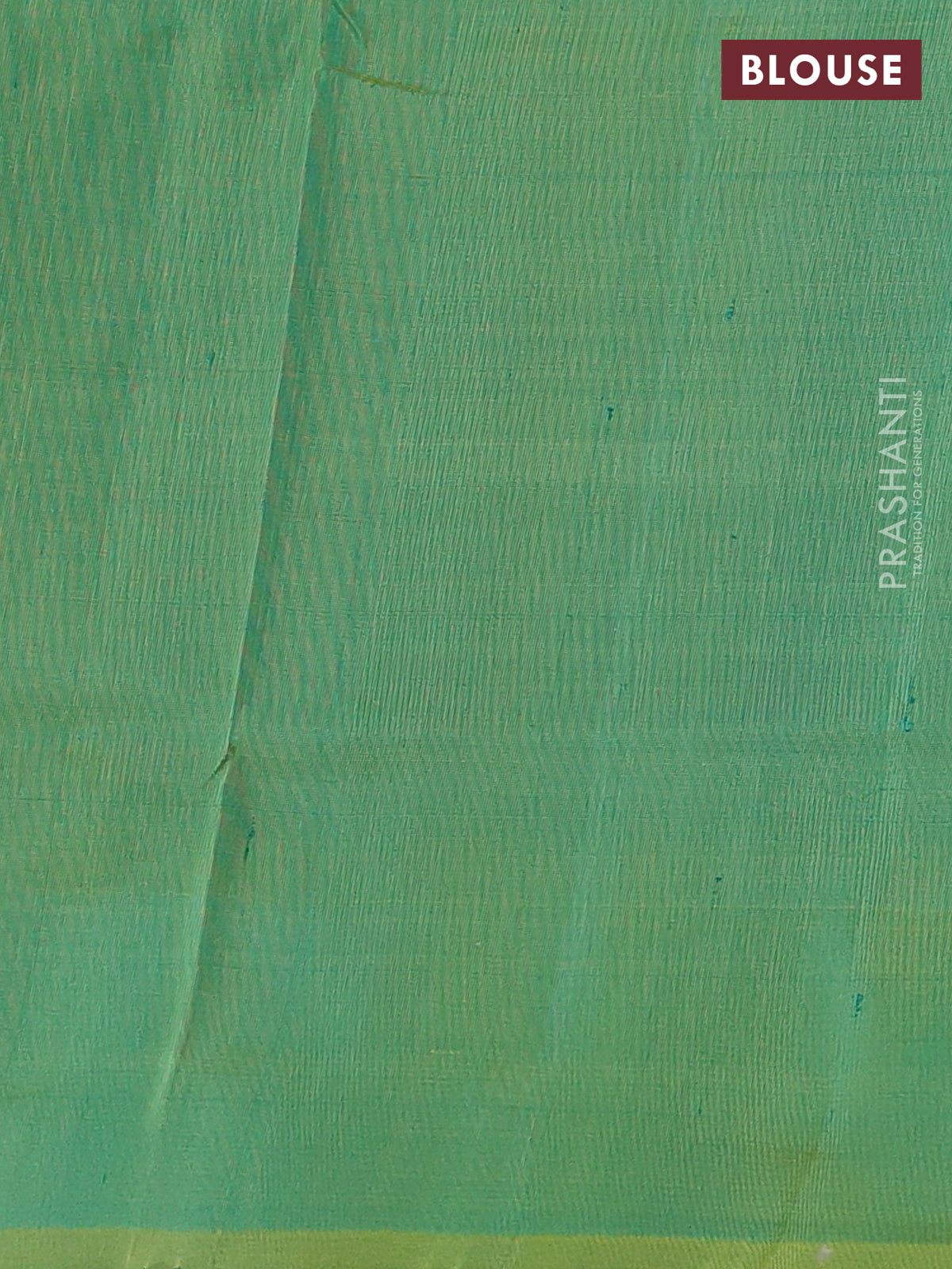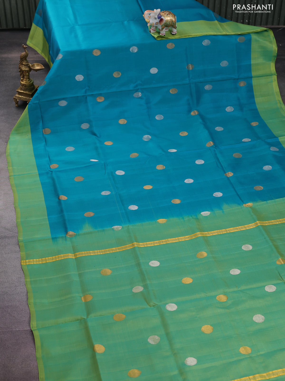 Pure uppada silk saree teal blue and dual shade of light green with silver & gold zari woven coin buttas and simple border