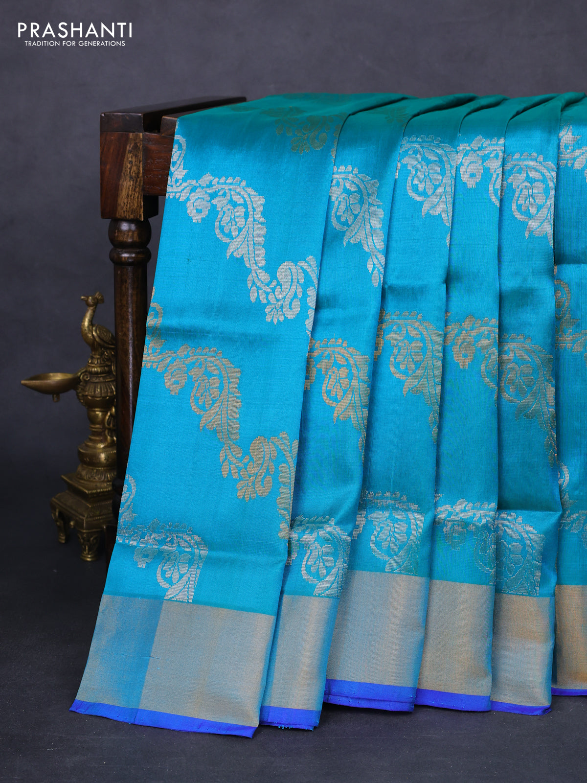 Pure uppada silk saree teal bluish green and blue with allover silver & gold zari weaves and zari woven border