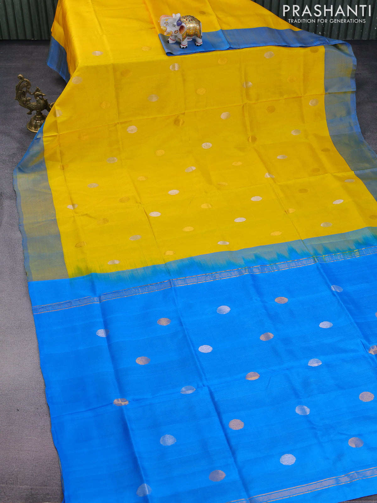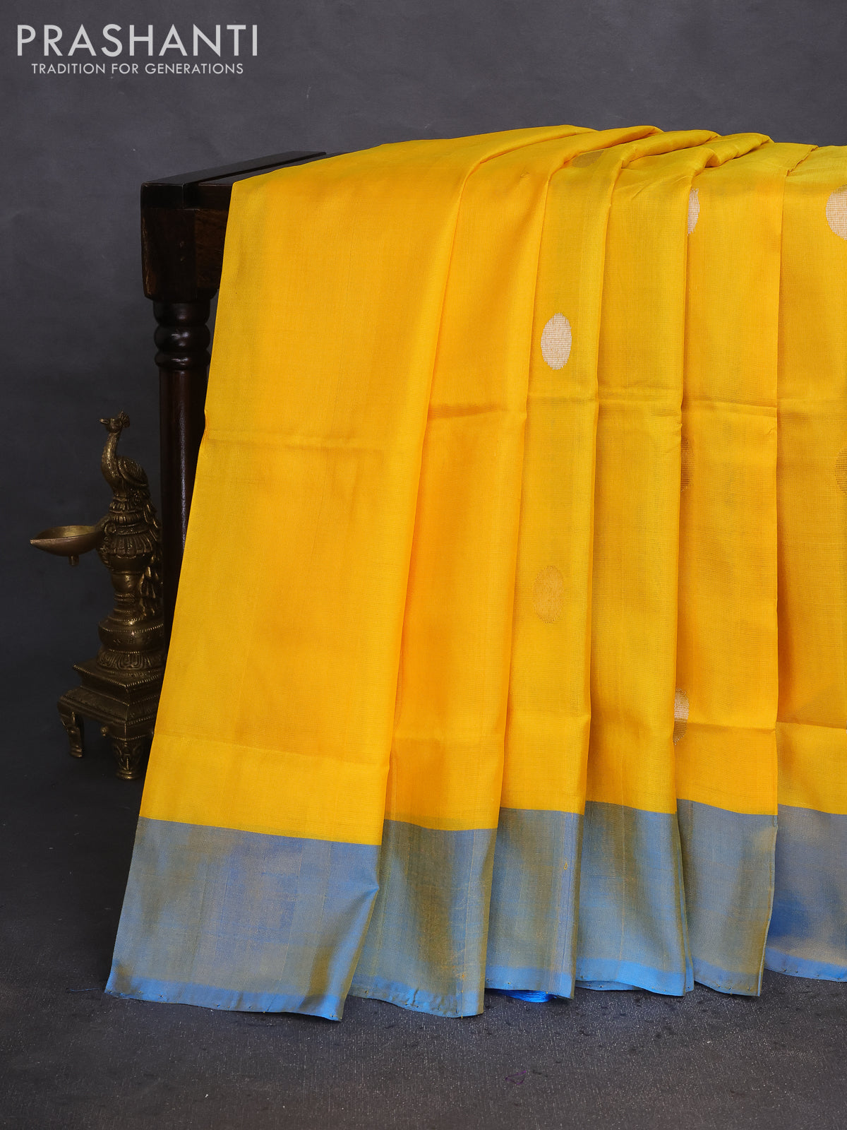 Pure uppada silk saree yellow and cs blue with silver & gold zari woven coin buttas and simple border