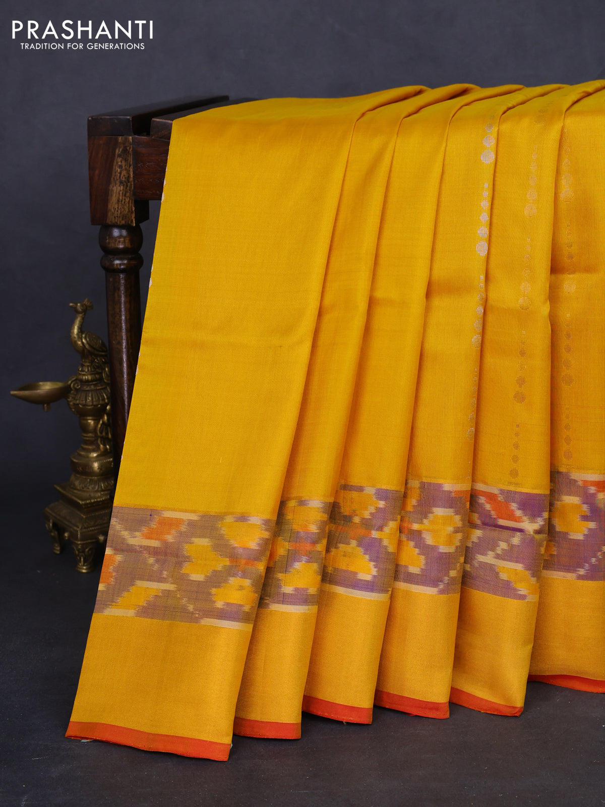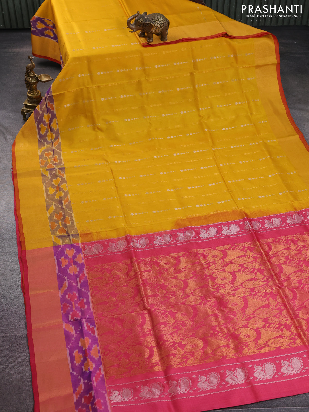 Pure uppada silk saree yellow and pink with silver & gold zari woven geometric buttas and ikat style zari woven border