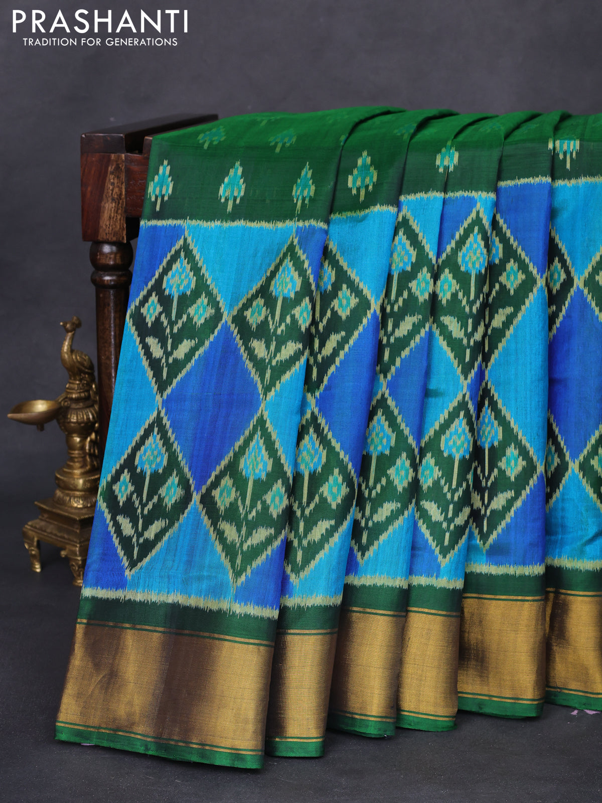 Rajkot patola silk saree green with allover ikat butta weaves and zari woven border