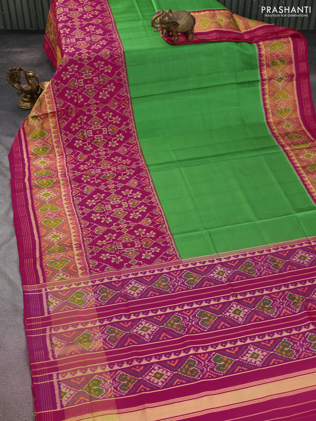 Rajkot patola silk saree green and pink with plain body and ikat woven zari border