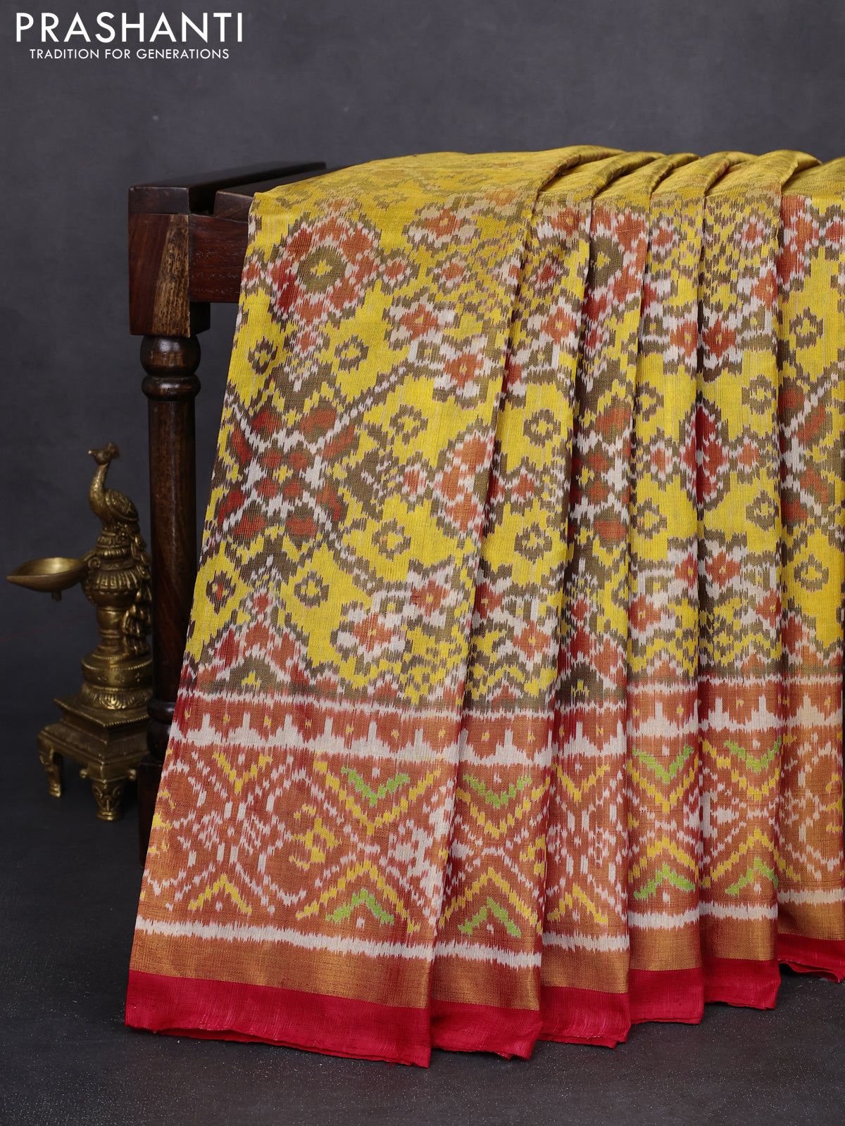 Rajkot patola tissue silk saree yellow and red with allover ikat weaves and ikat woven zari border