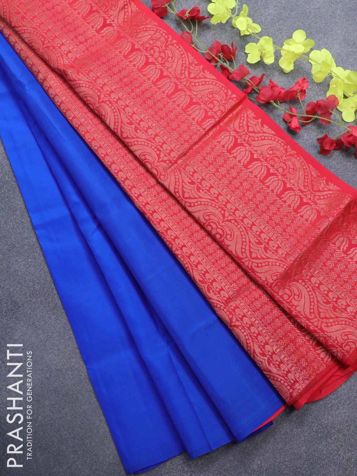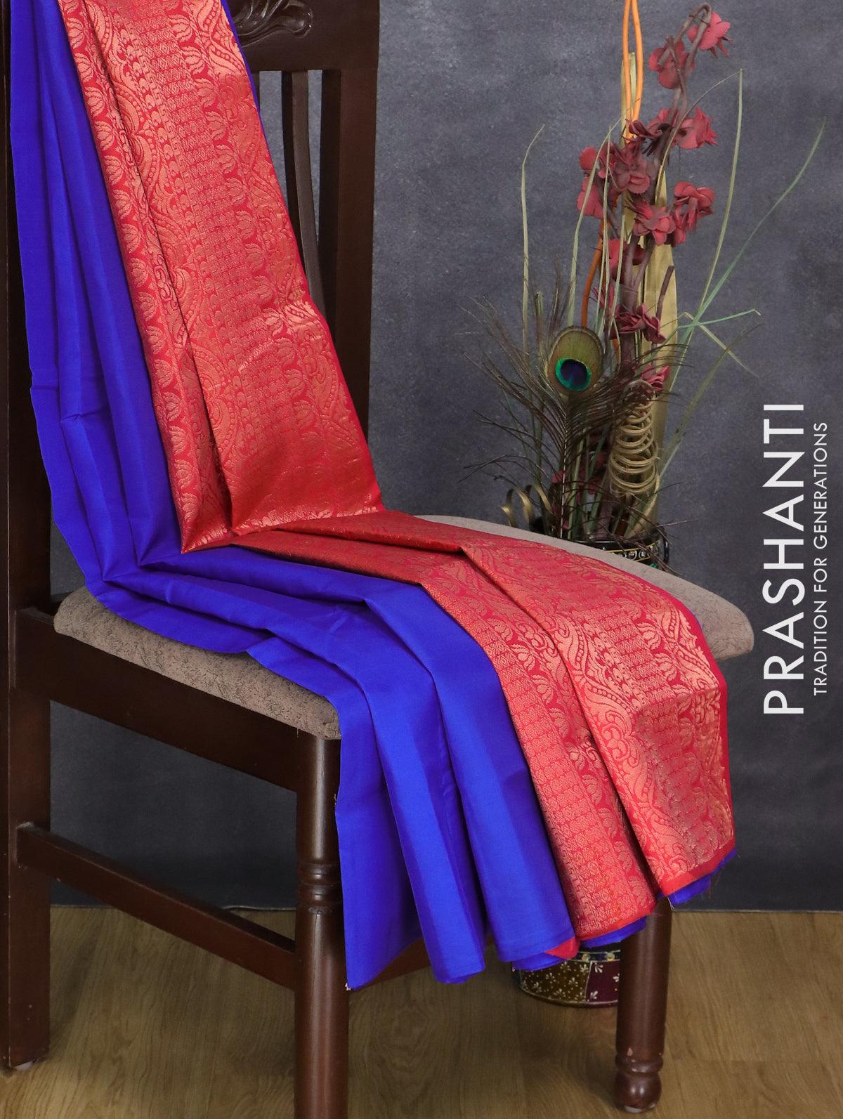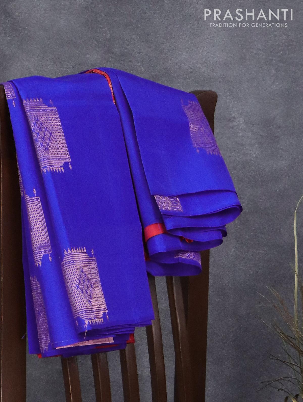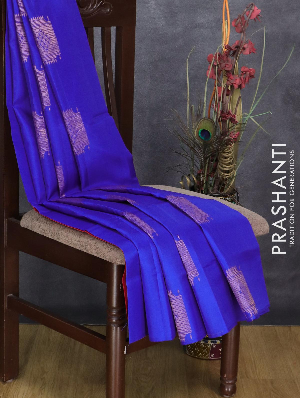 Kanchipuram silk saree royal blue and dual shade of orangish pink with copper zari woven buttas in borderless style