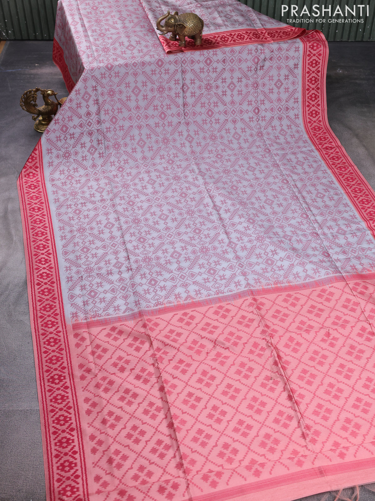 Sambalpuri semi silk saree grey and peach orange with allover ikat weaves and thread woven border