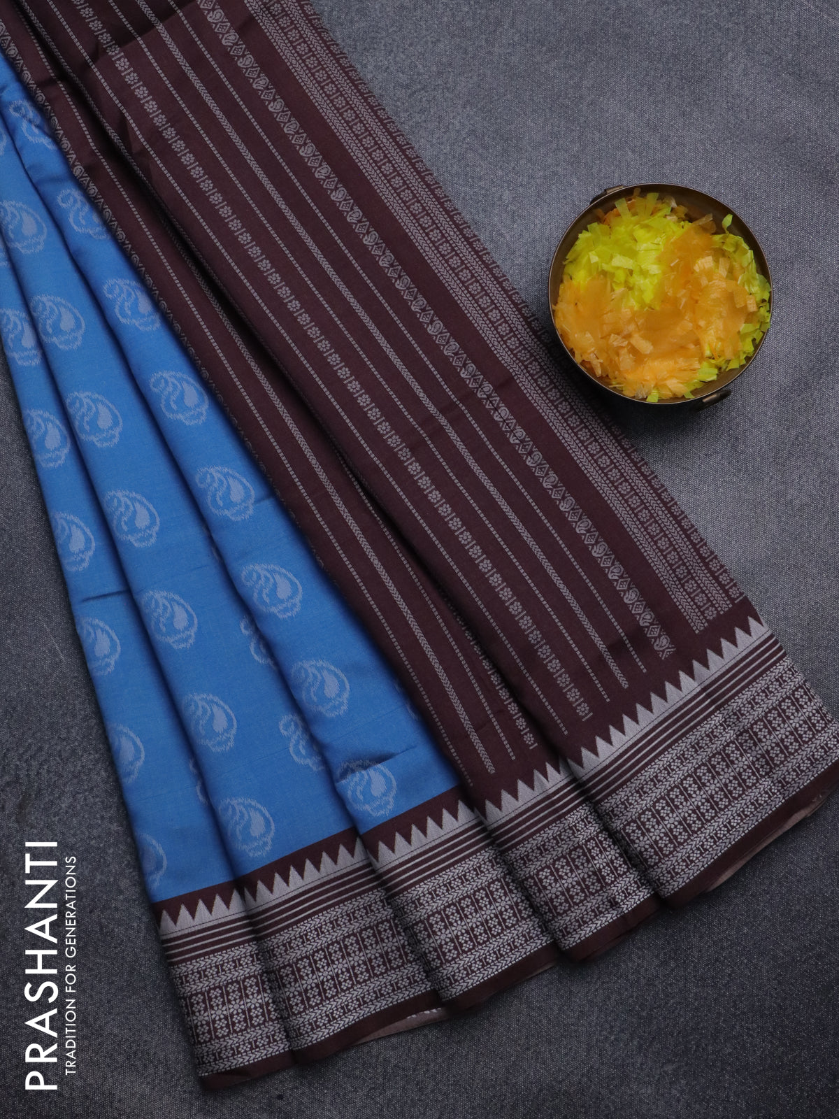 Sambalpuri semi silk saree light blue and brown with paisley butta weaves and thread woven border