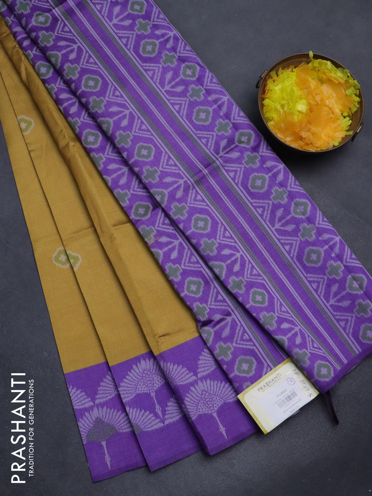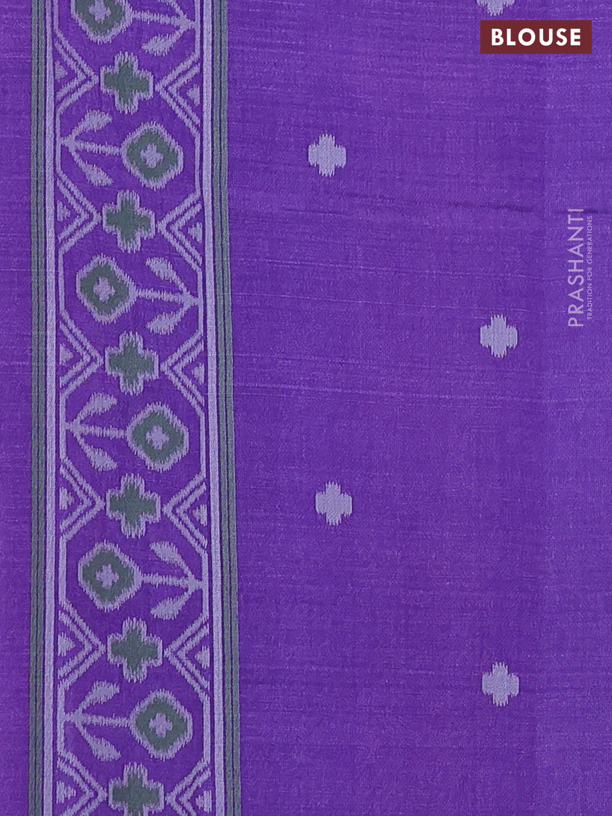 Sambalpuri semi silk saree mustard yellow and violet with allover ikat butta weaves and thread woven border