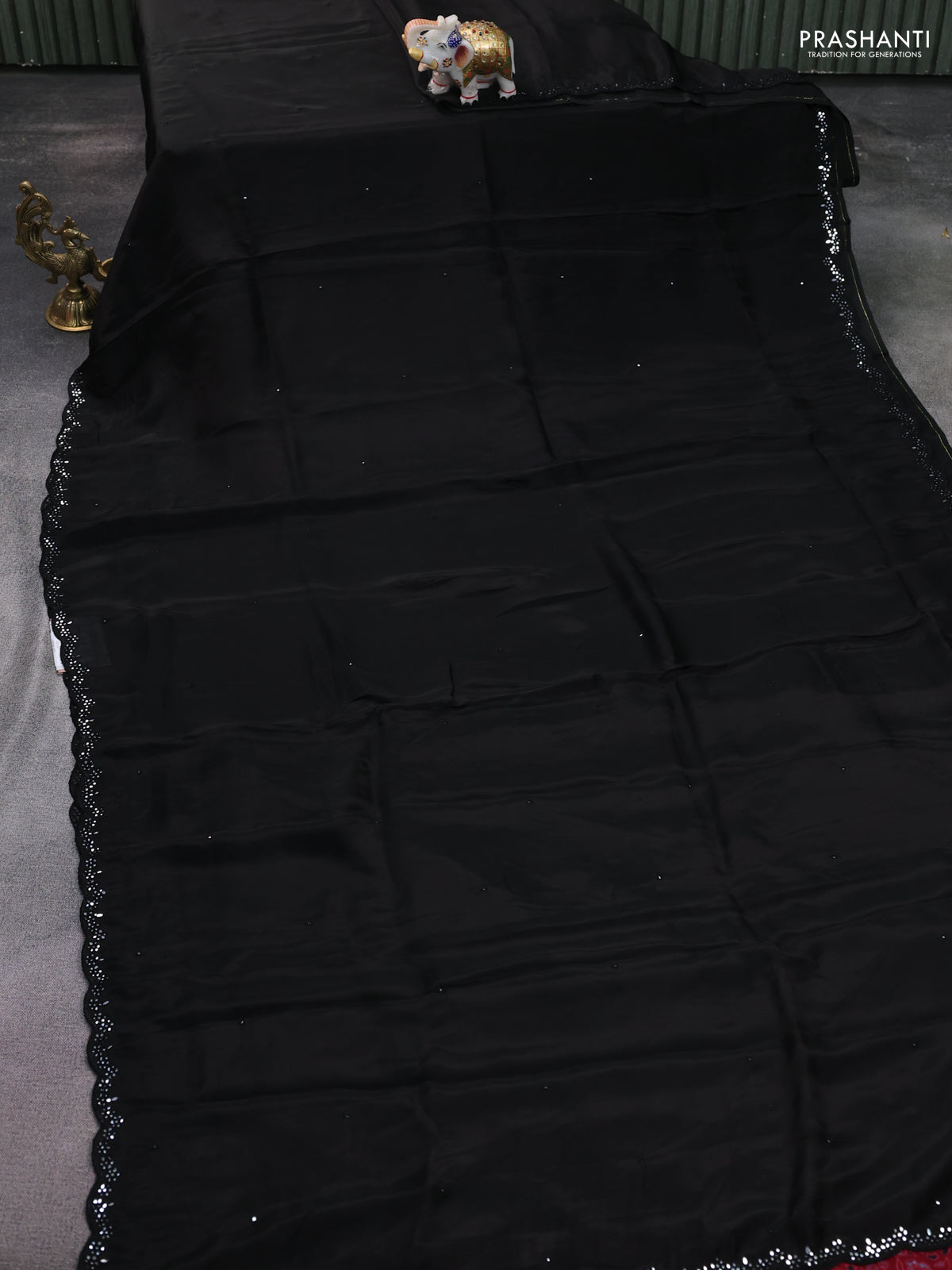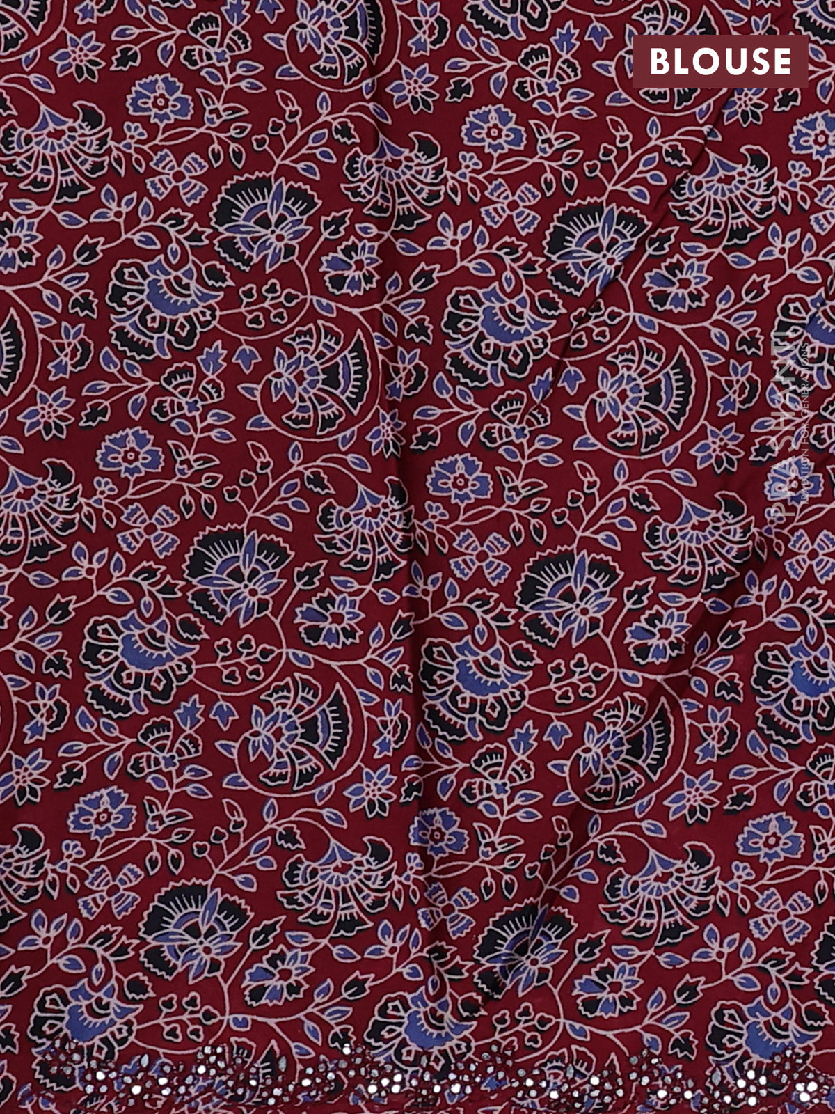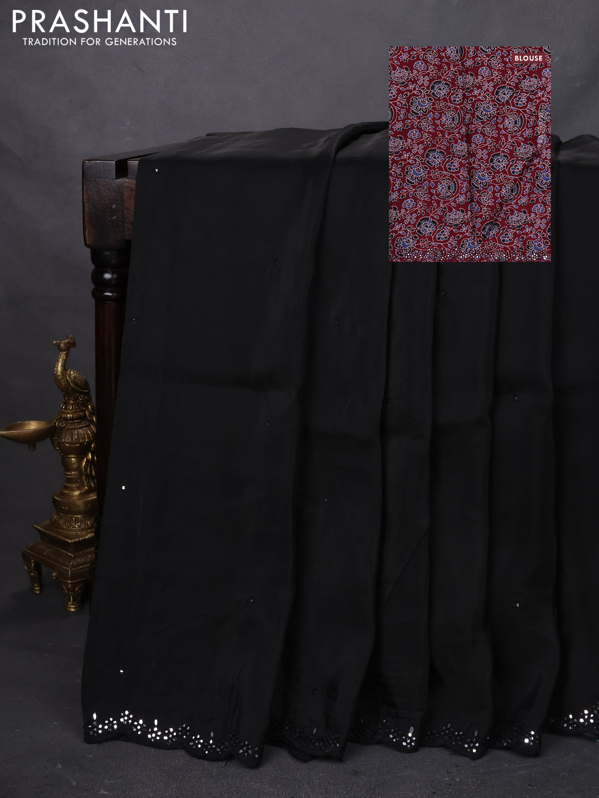 Satin crepe silk saree black and maroon with mirror work and ajrakh printed blouse