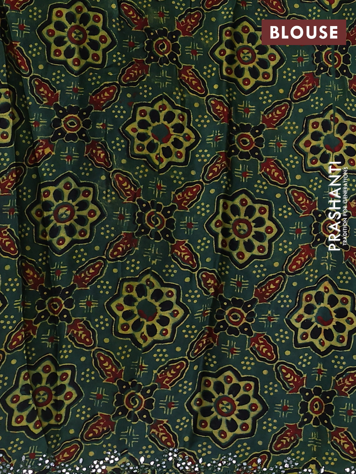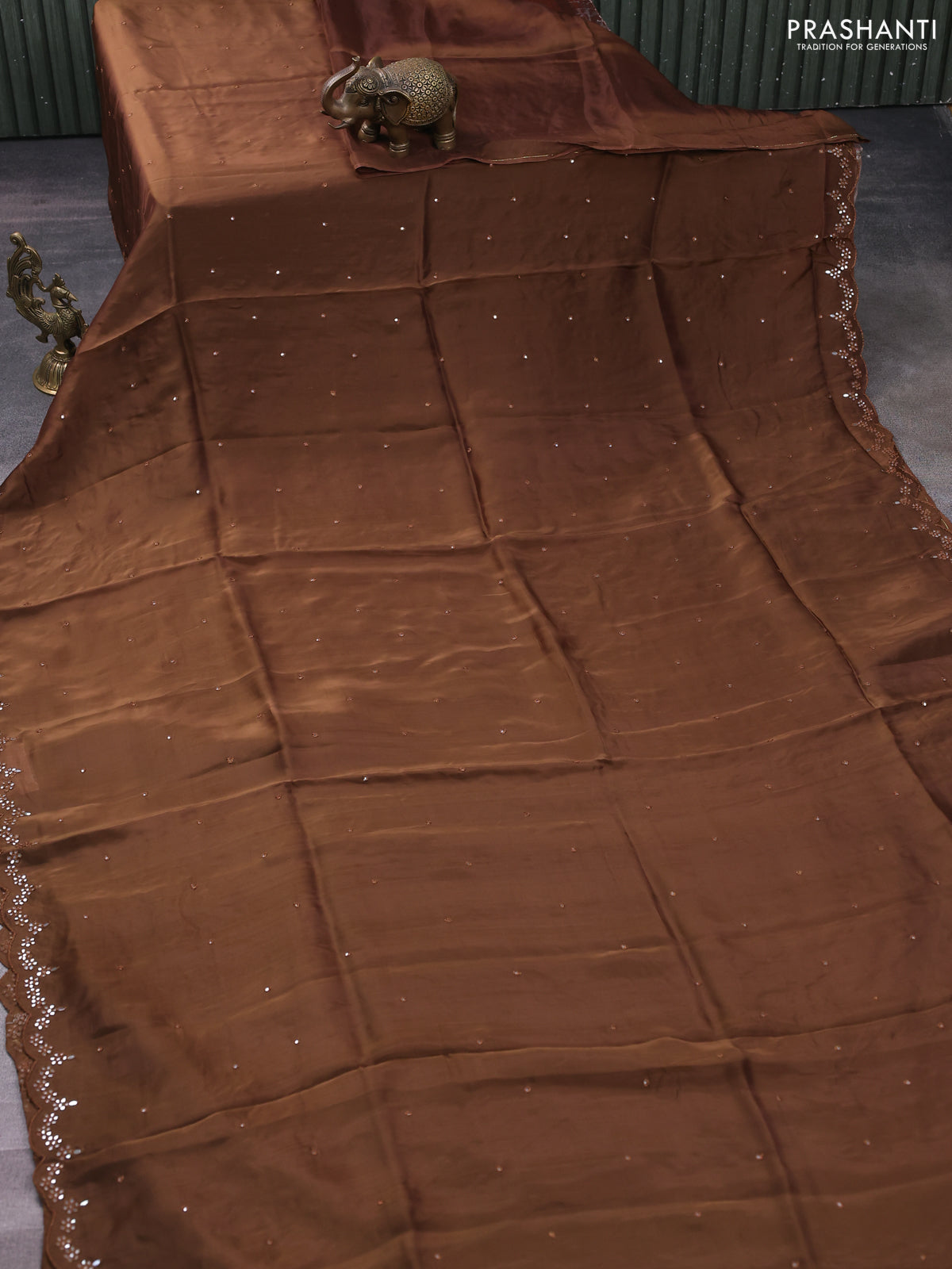Satin crepe silk saree brown and green with allover mirror work and ajrakh printed blouse