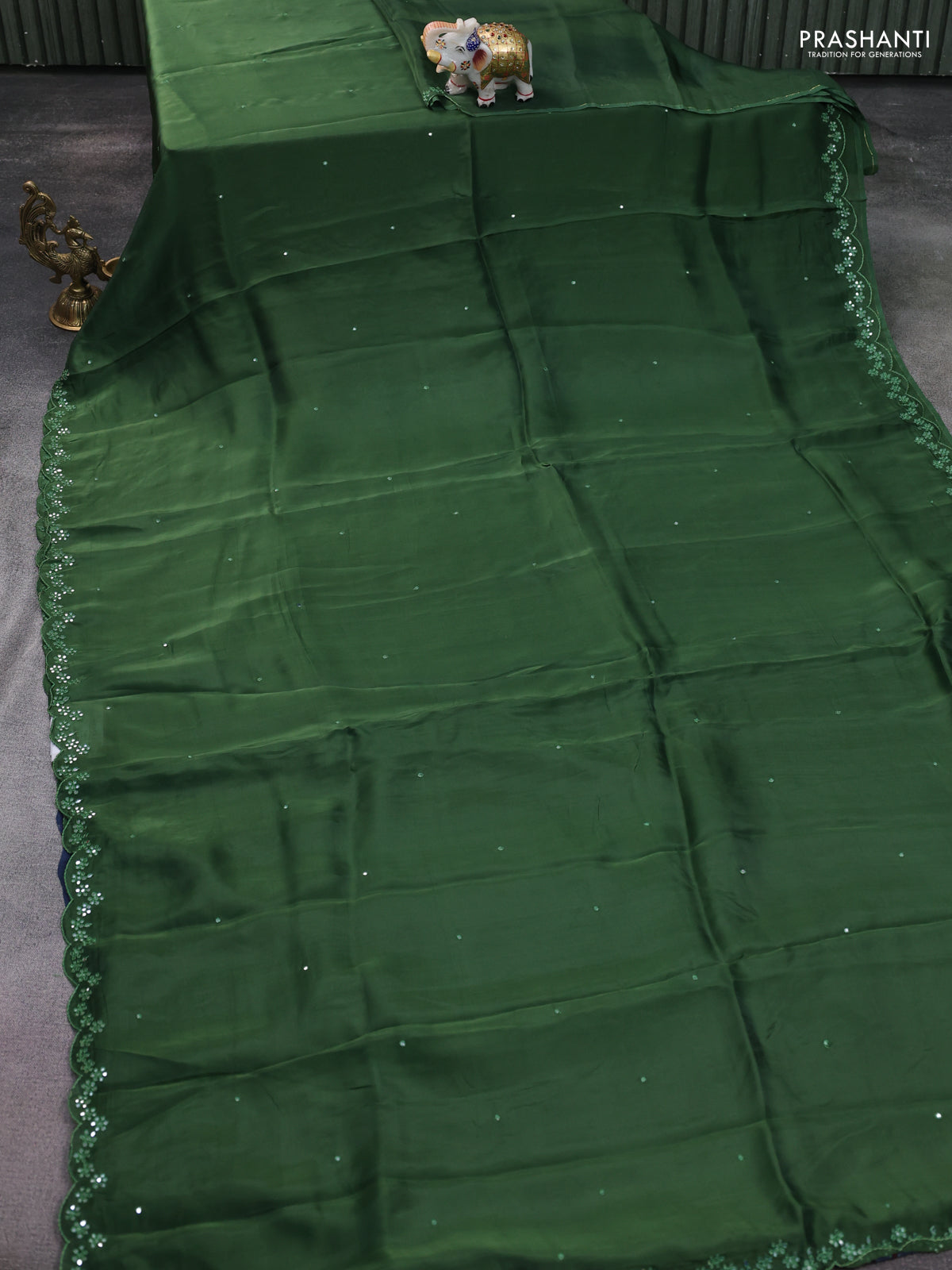 Satin crepe silk saree green and blue with mirror work and ajrakh printed blouse