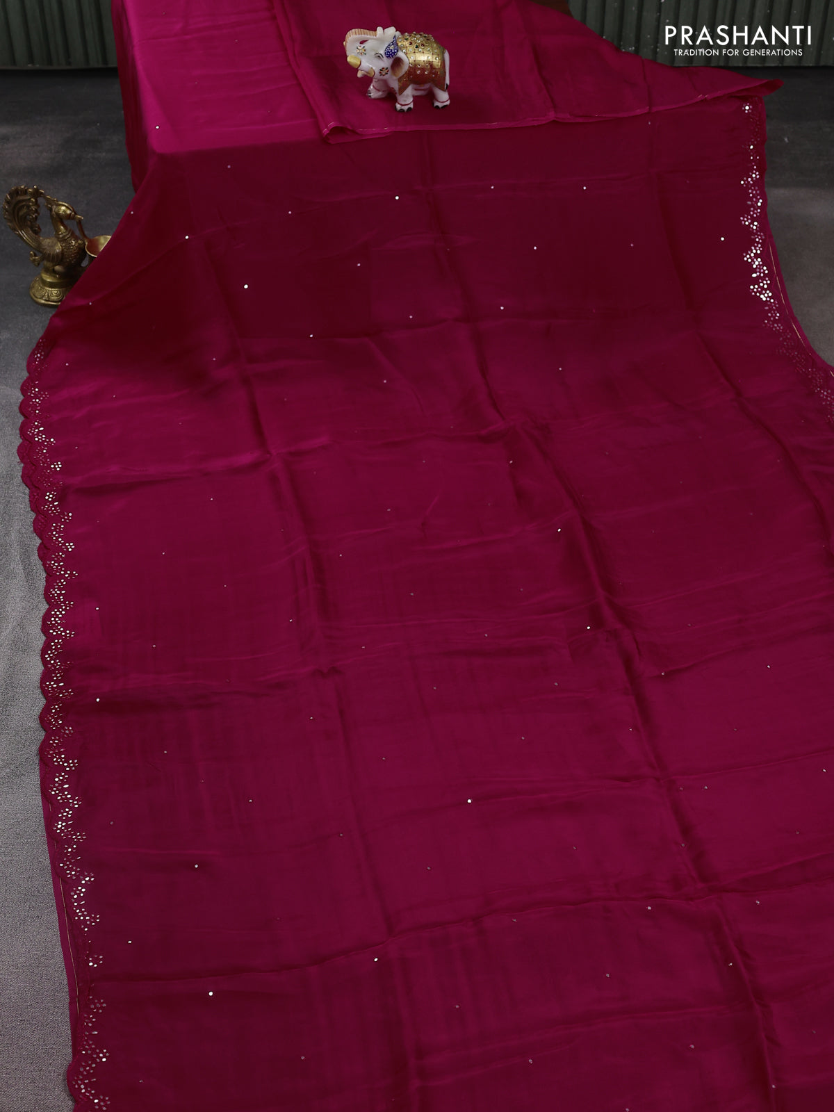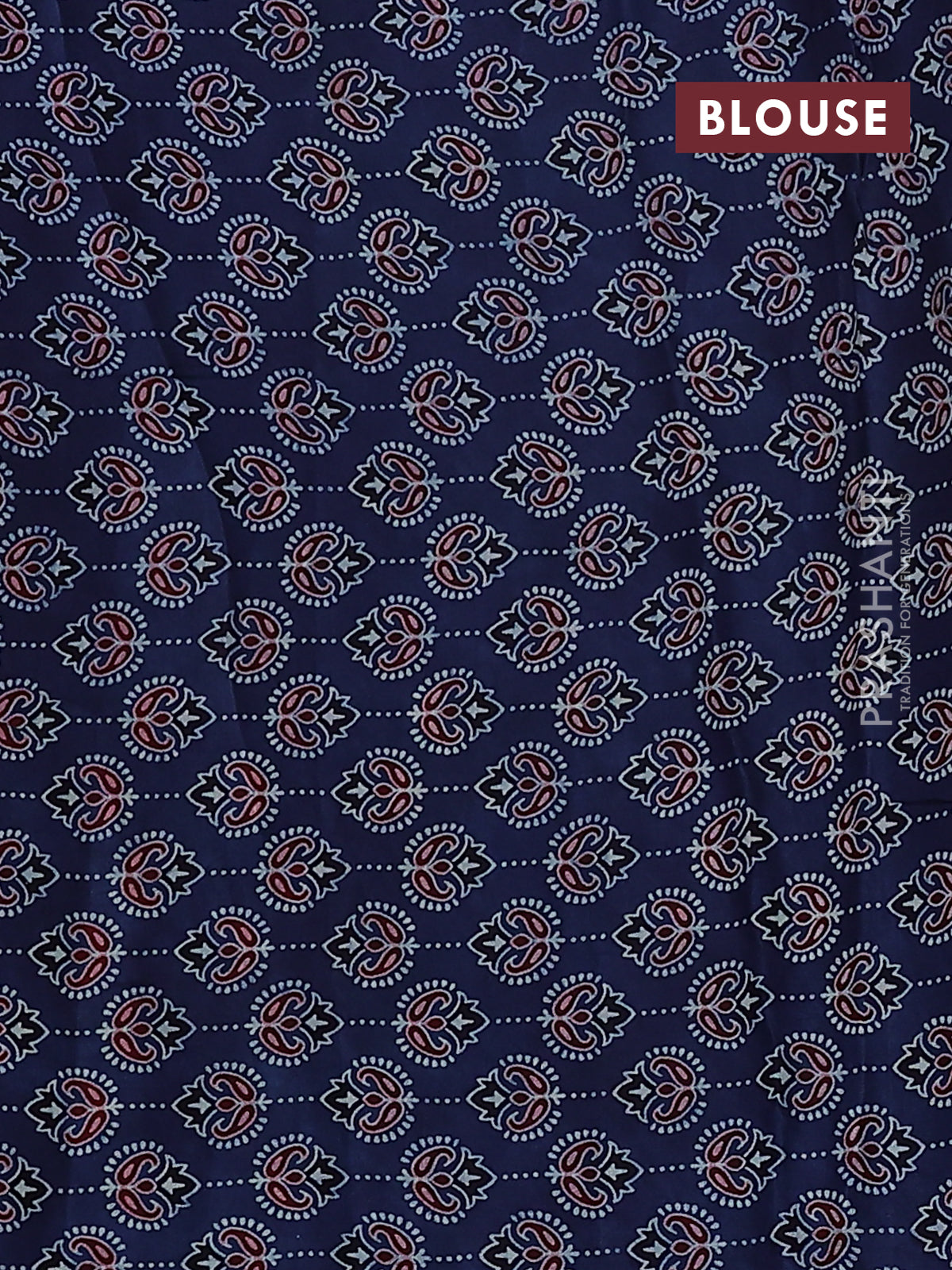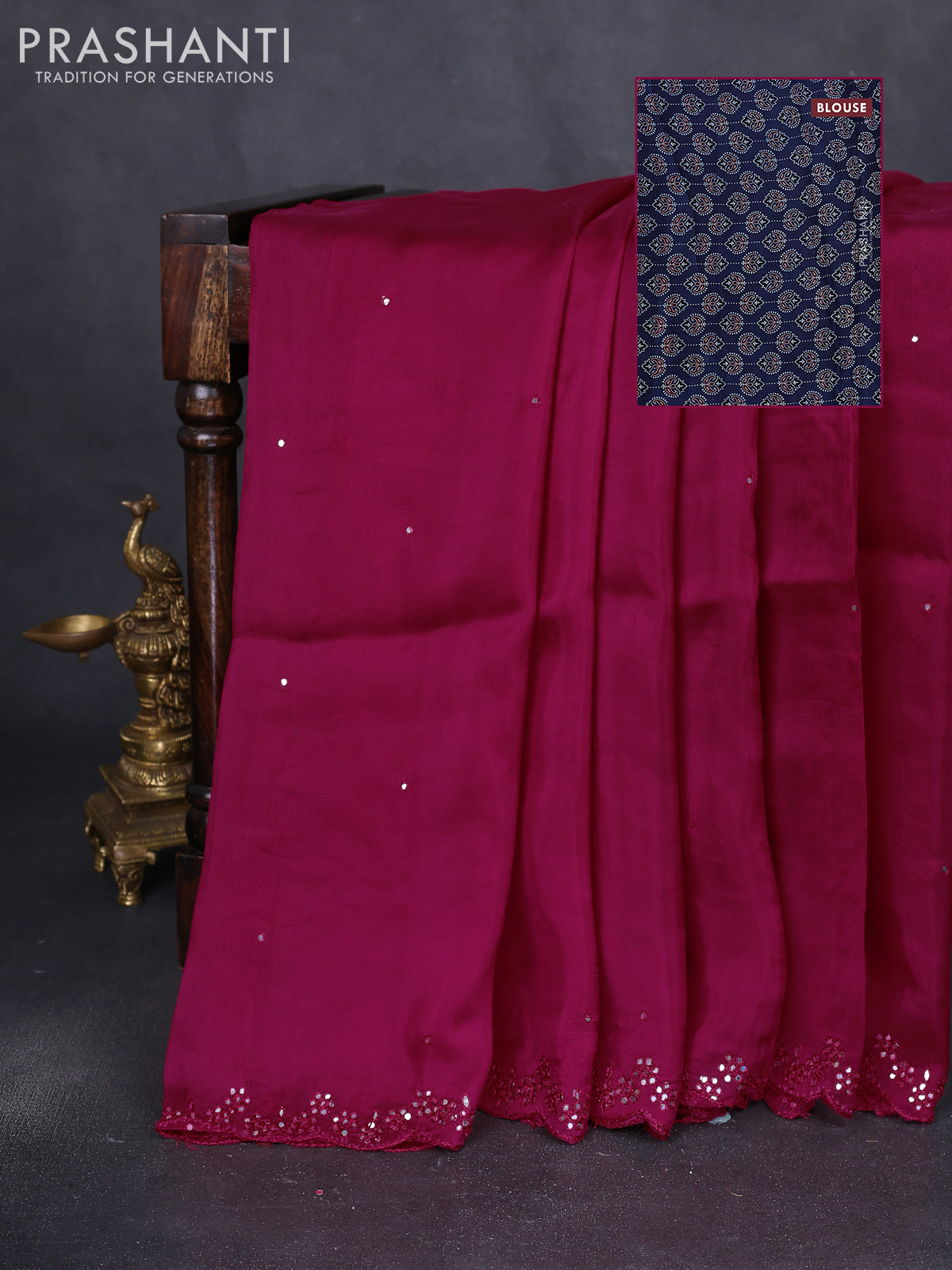 Satin crepe silk saree pink and blue with allover mirror work and ajrakh printed blouse