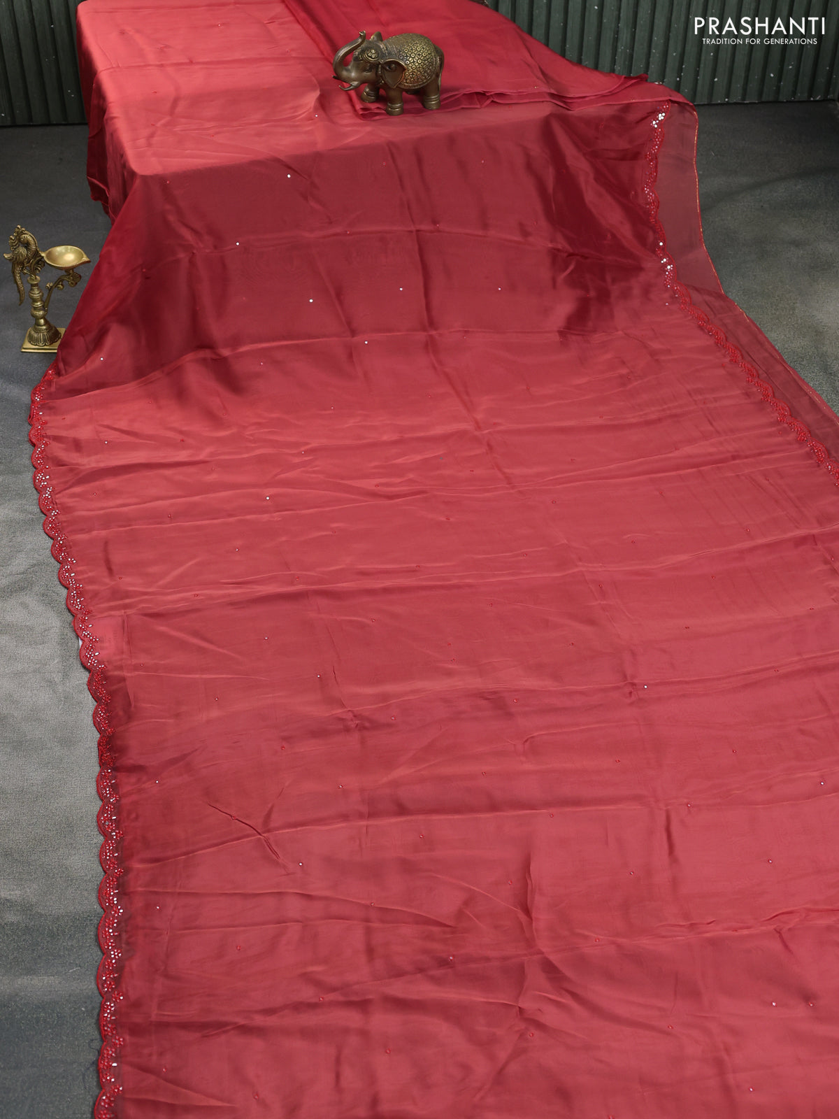Satin crepe silk saree red and blue with mirror work and ajrakh printed blouse