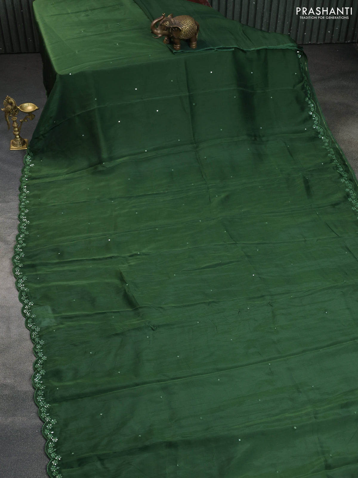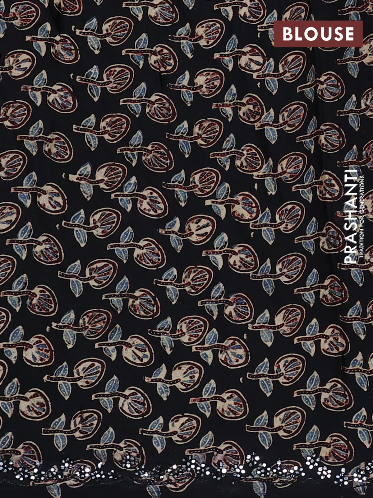 Satin crepe silk saree sap green and black with mirror work and ajrakh printed blouse