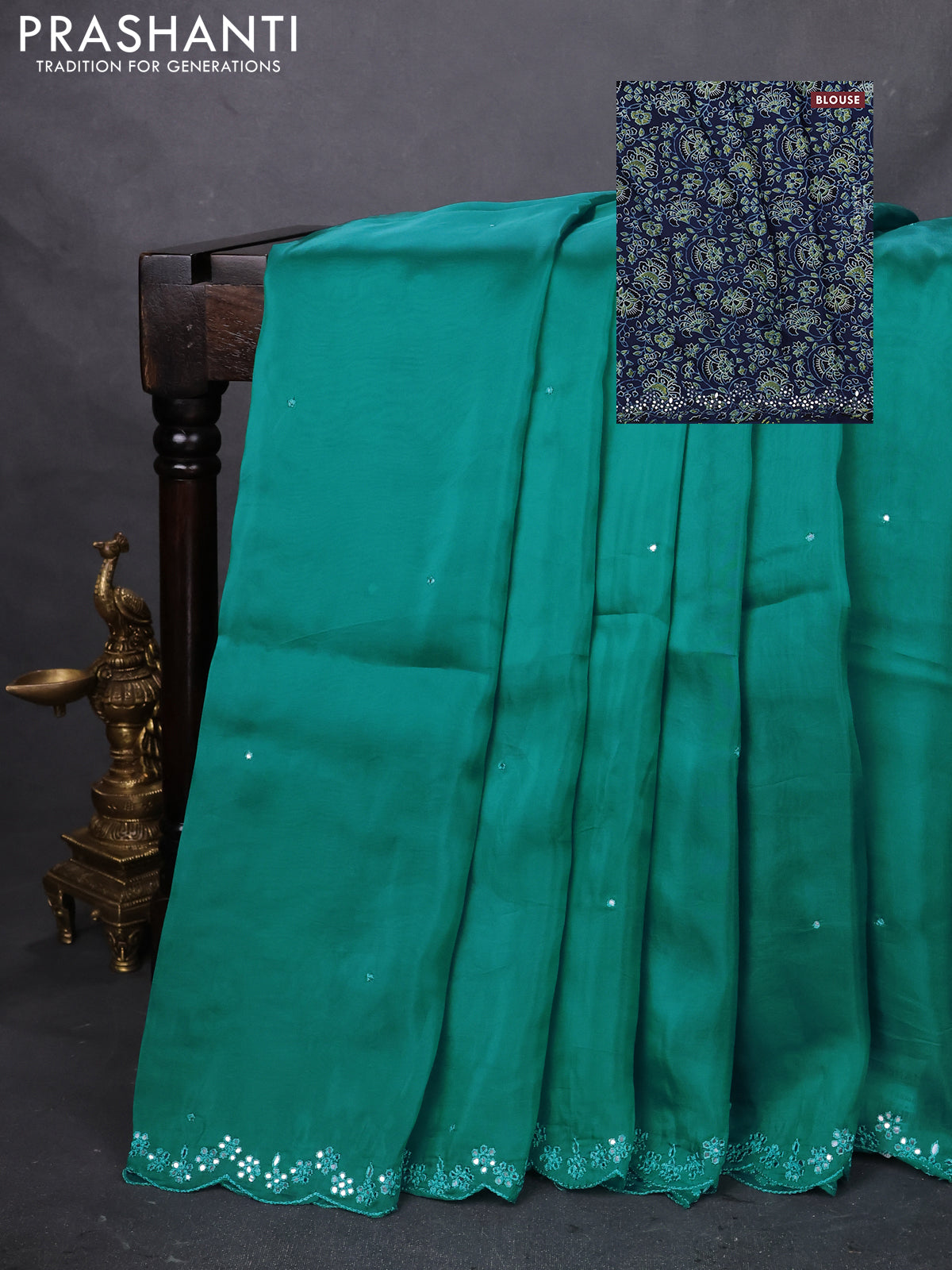 Satin crepe silk saree teal blue and navy blue with mirror work and ajrakh printed blouse