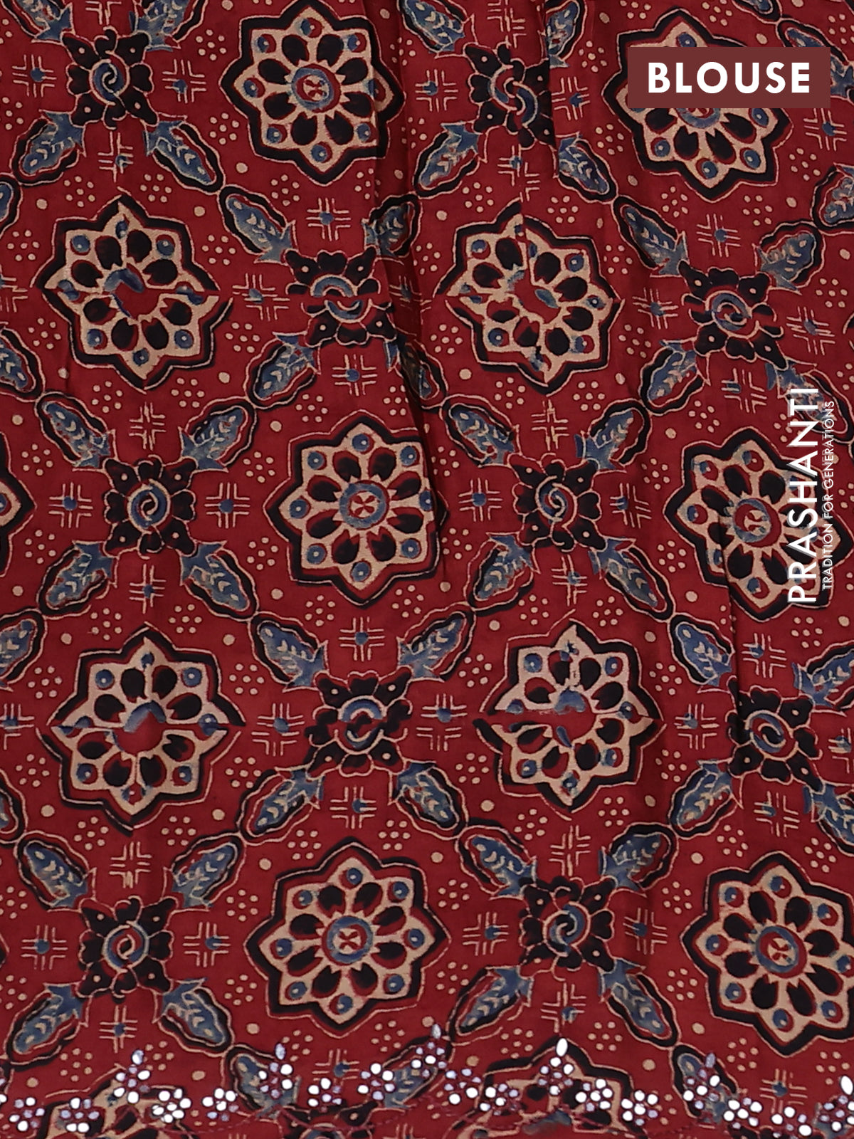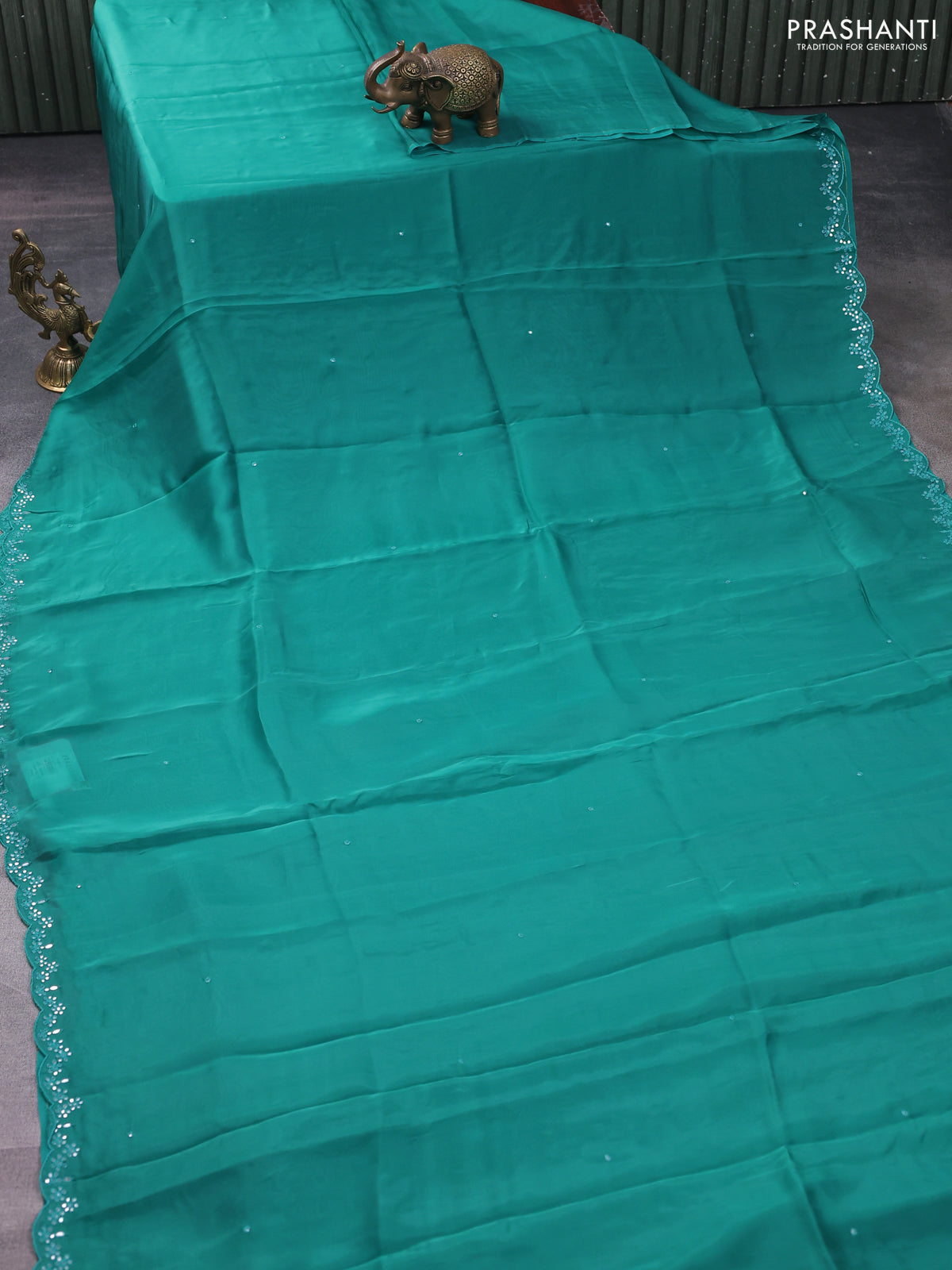Satin crepe silk saree teal green and maroon with allover mirror work and ajrakh printed blouse