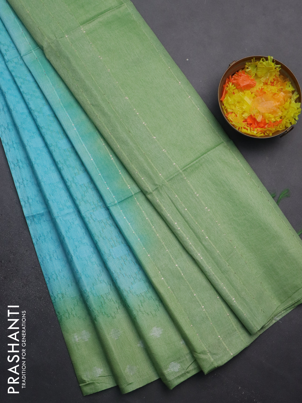 Semi bamboo saree light blue and pastel green with allover thread weaves and sequin work pallu
