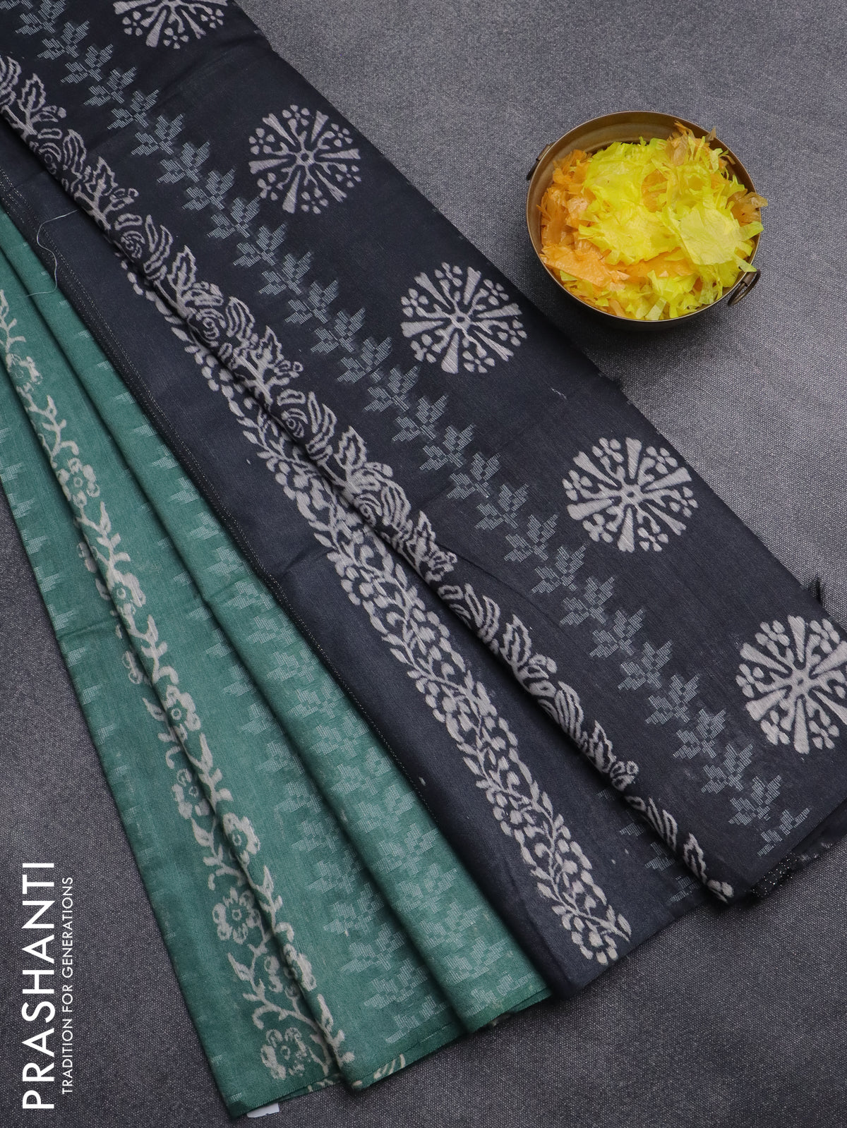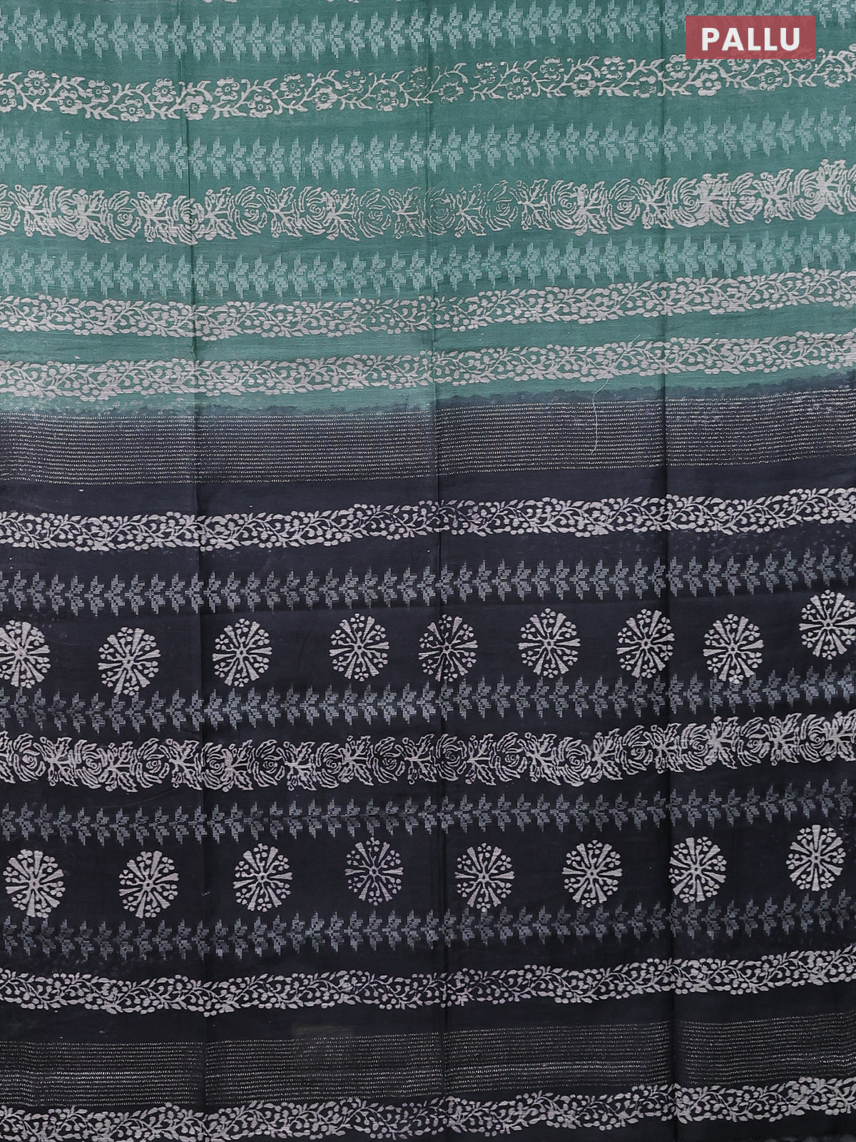 Semi bamboo saree pastel green shade and dark grey with allover thread weaves & prints in borderless style