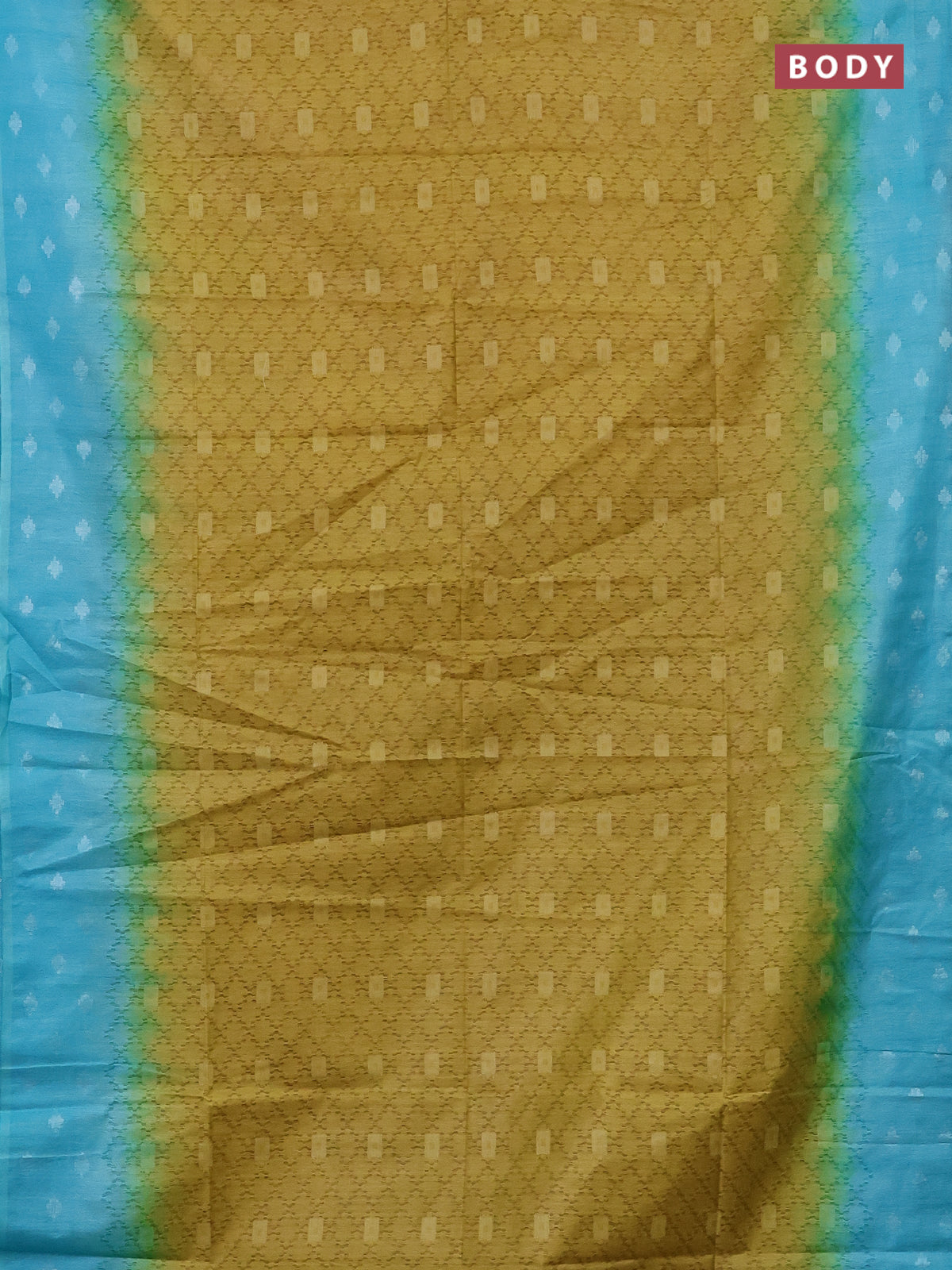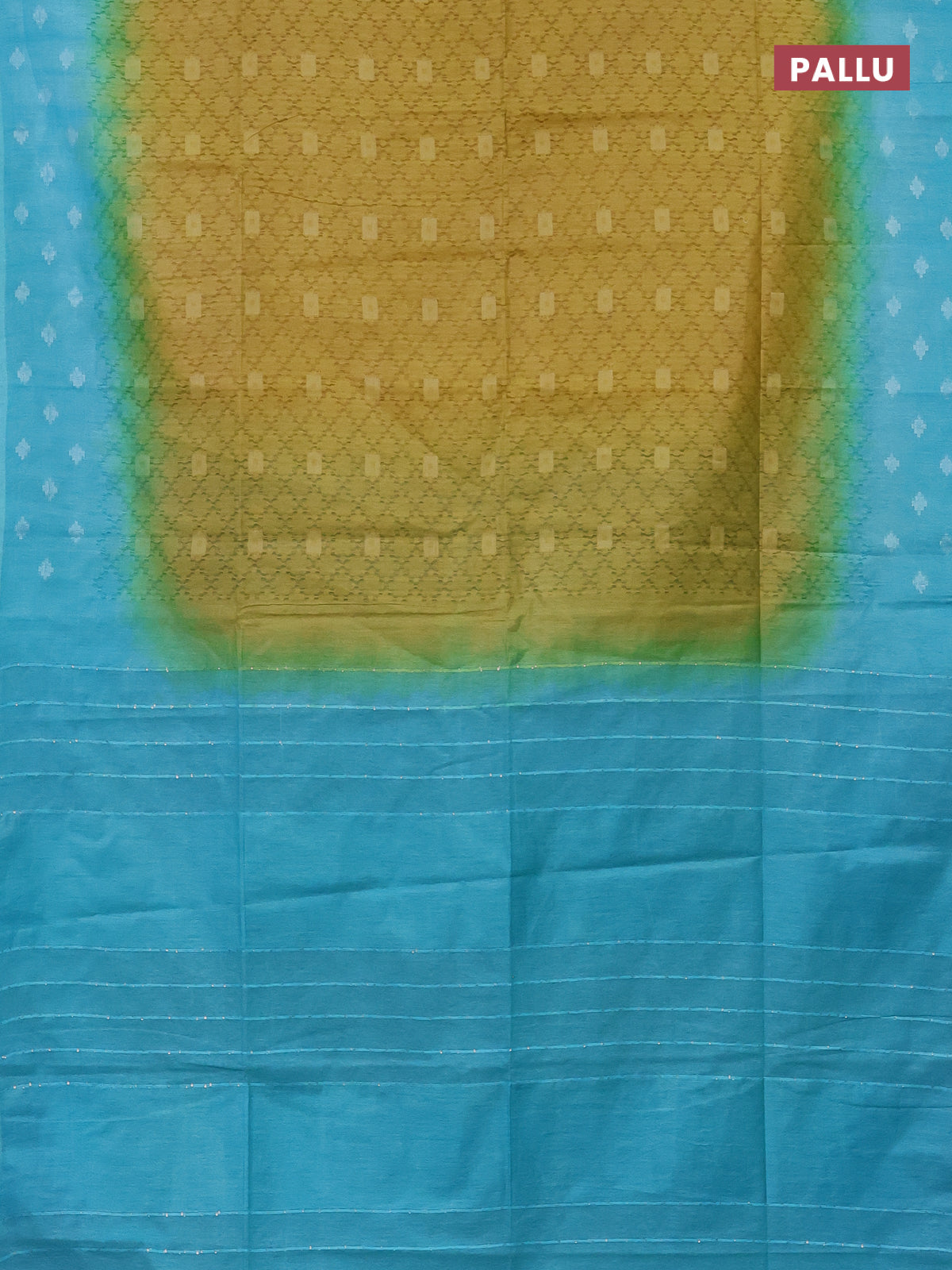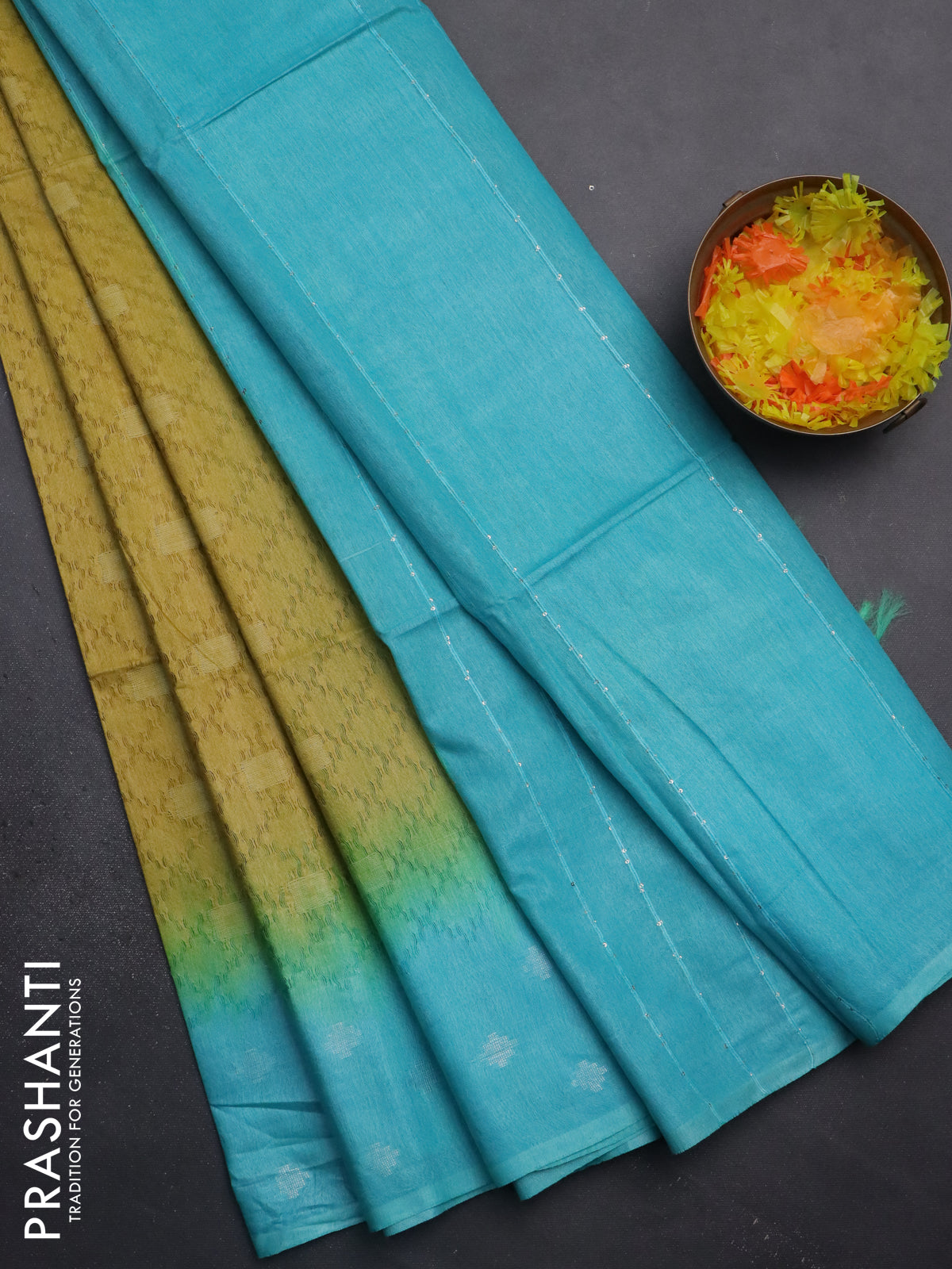 Semi bamboo saree yellow and teal blue with allover thread weaves and sequin work pallu