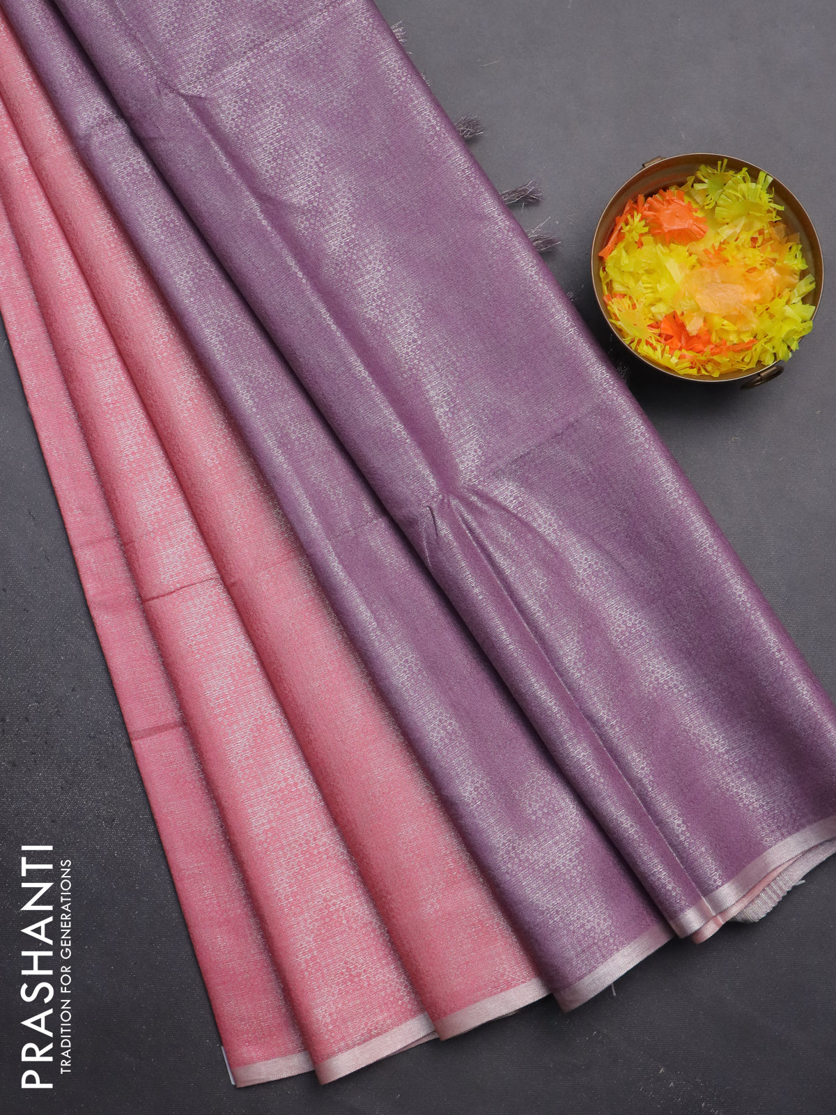 Semi bamboo tissue saree peach pink and mild purple with allover silver zari weaves and zari woven piping border