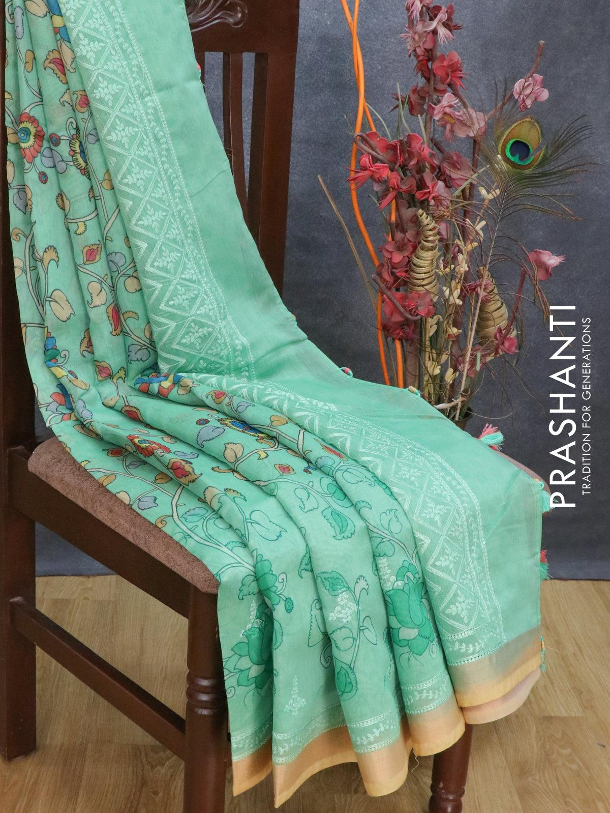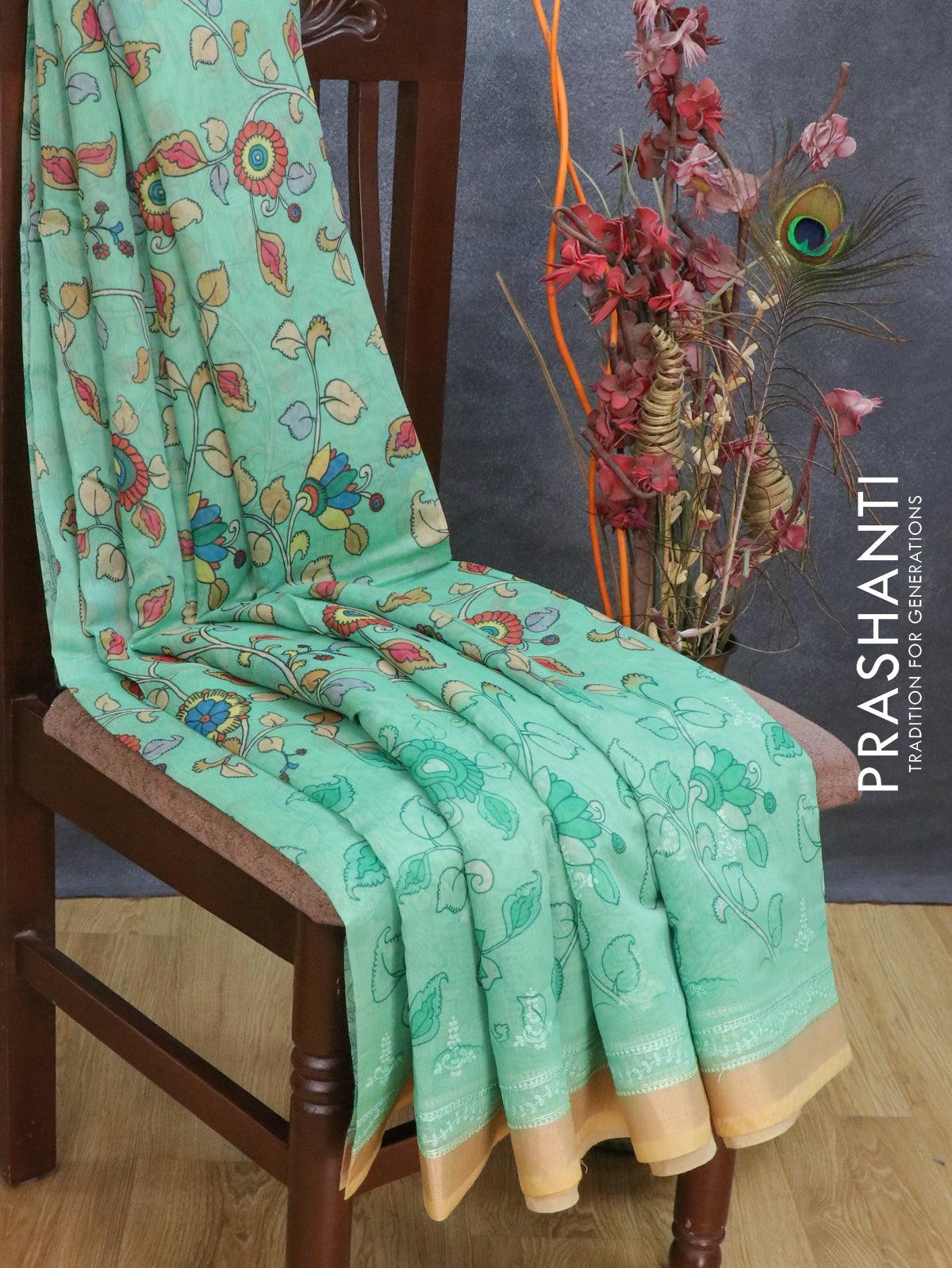 Semi chanderi saree green and sandal with allover floral prints & embroidery work and embroidery border