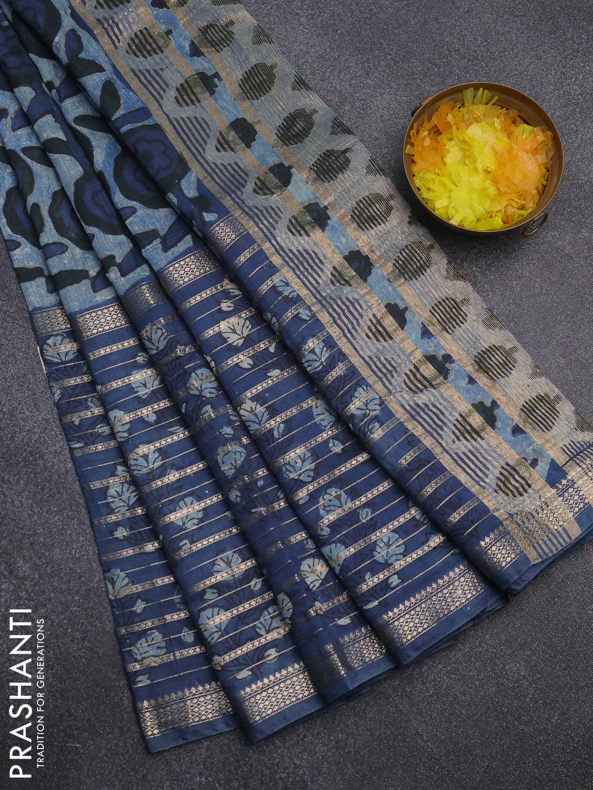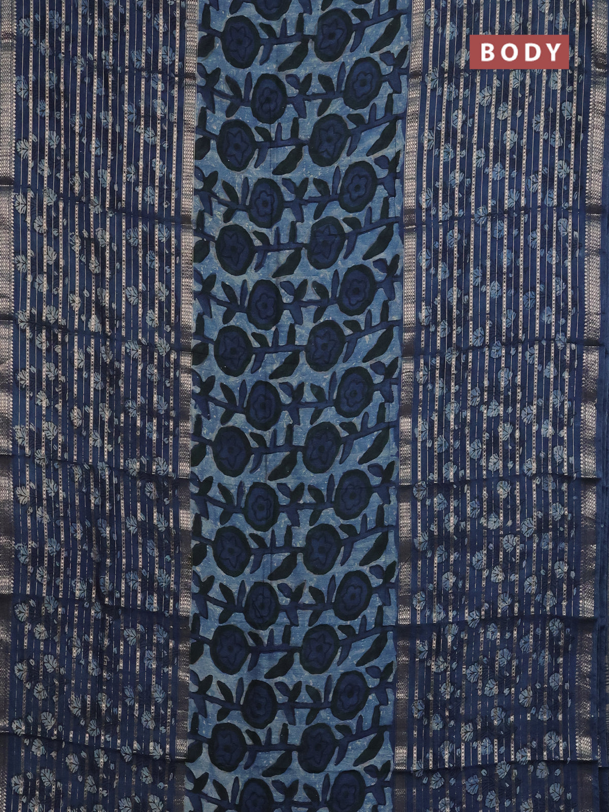 Semi chanderi saree indigo blue and blue with allover ajrakh prints and long printed zari border