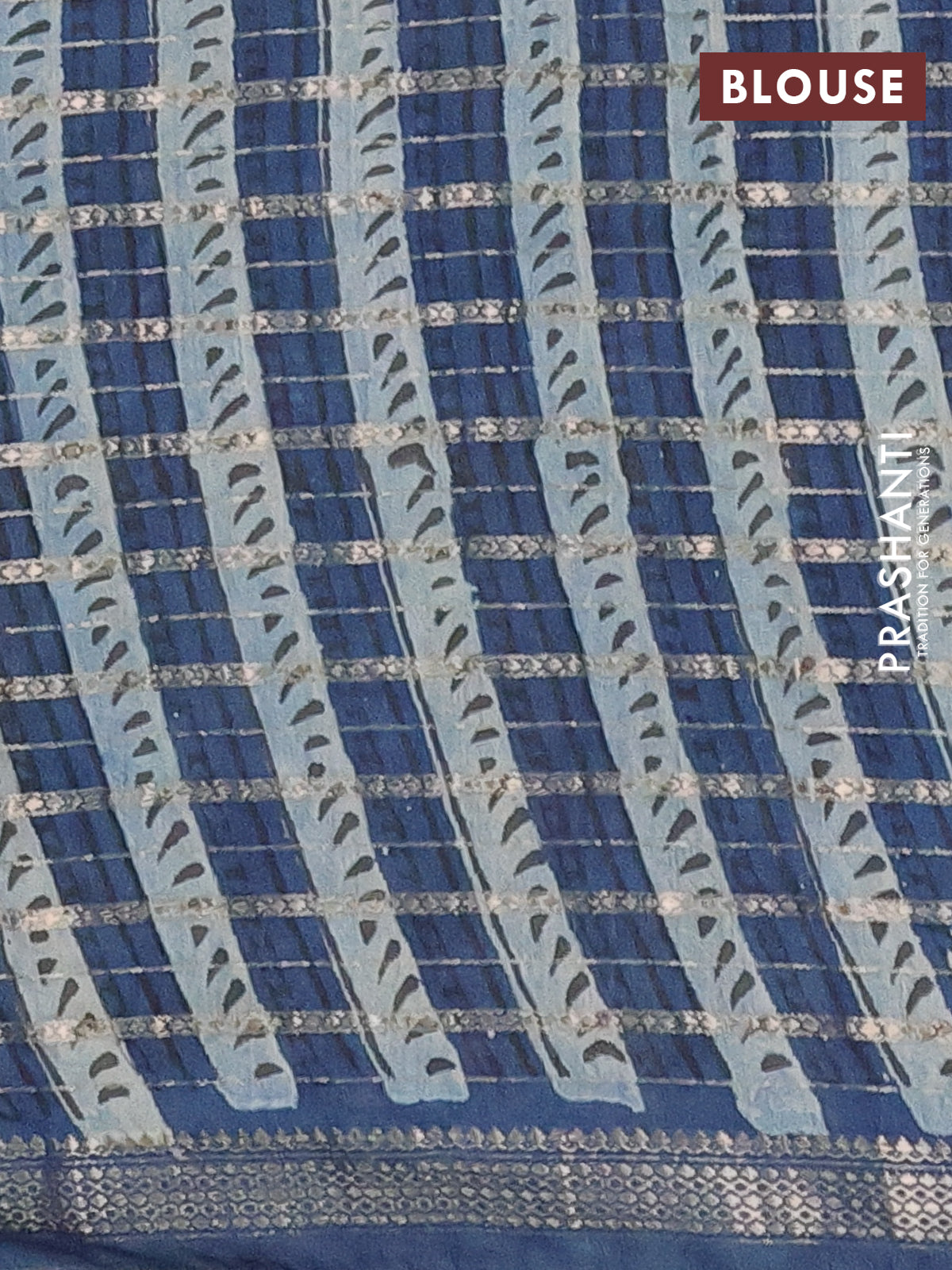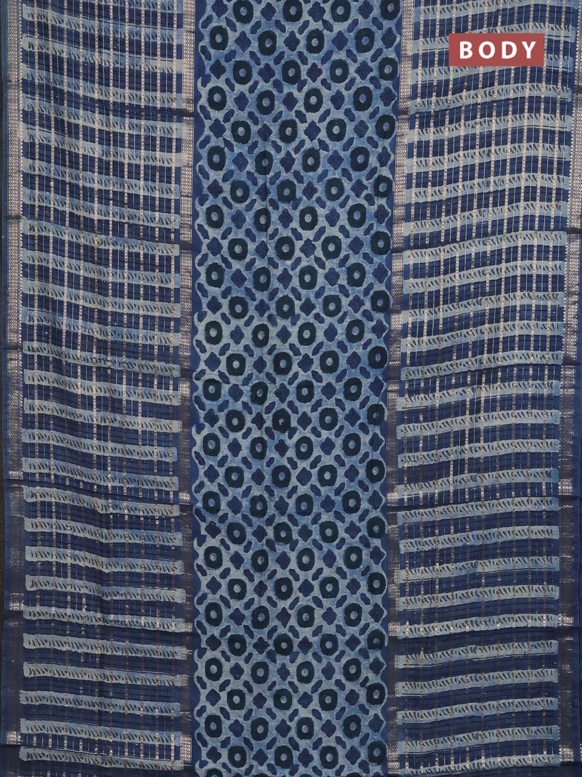 Semi chanderi saree indigo blue and blue with allover ajrakh prints and long printed zari border