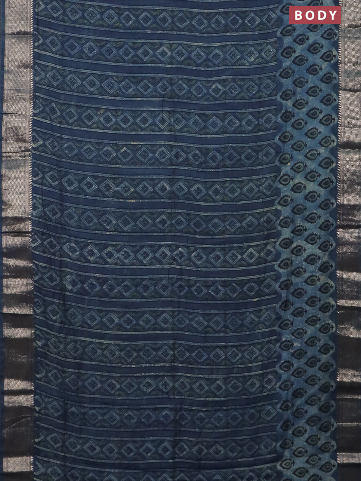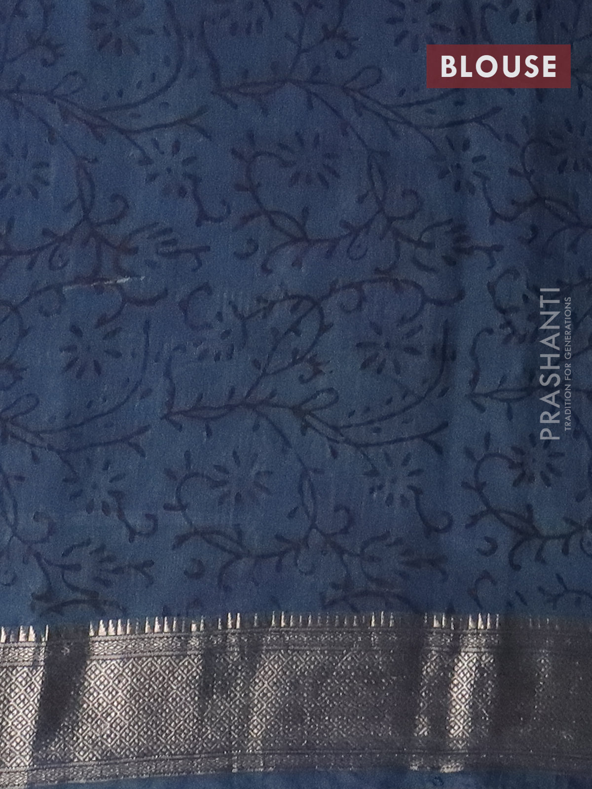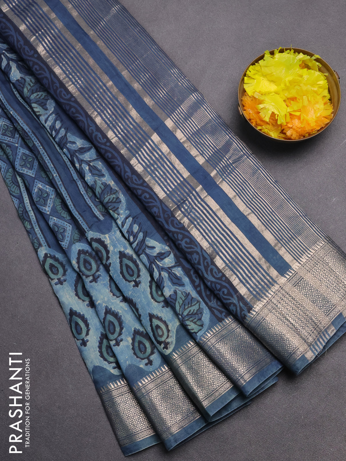 Semi chanderi saree indigo blue with allover vanaspathi prints and zari woven border