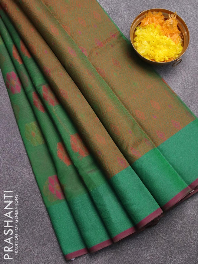 Semi chanderi saree light green and pink with butta prints & kantha stitch work and zari woven border