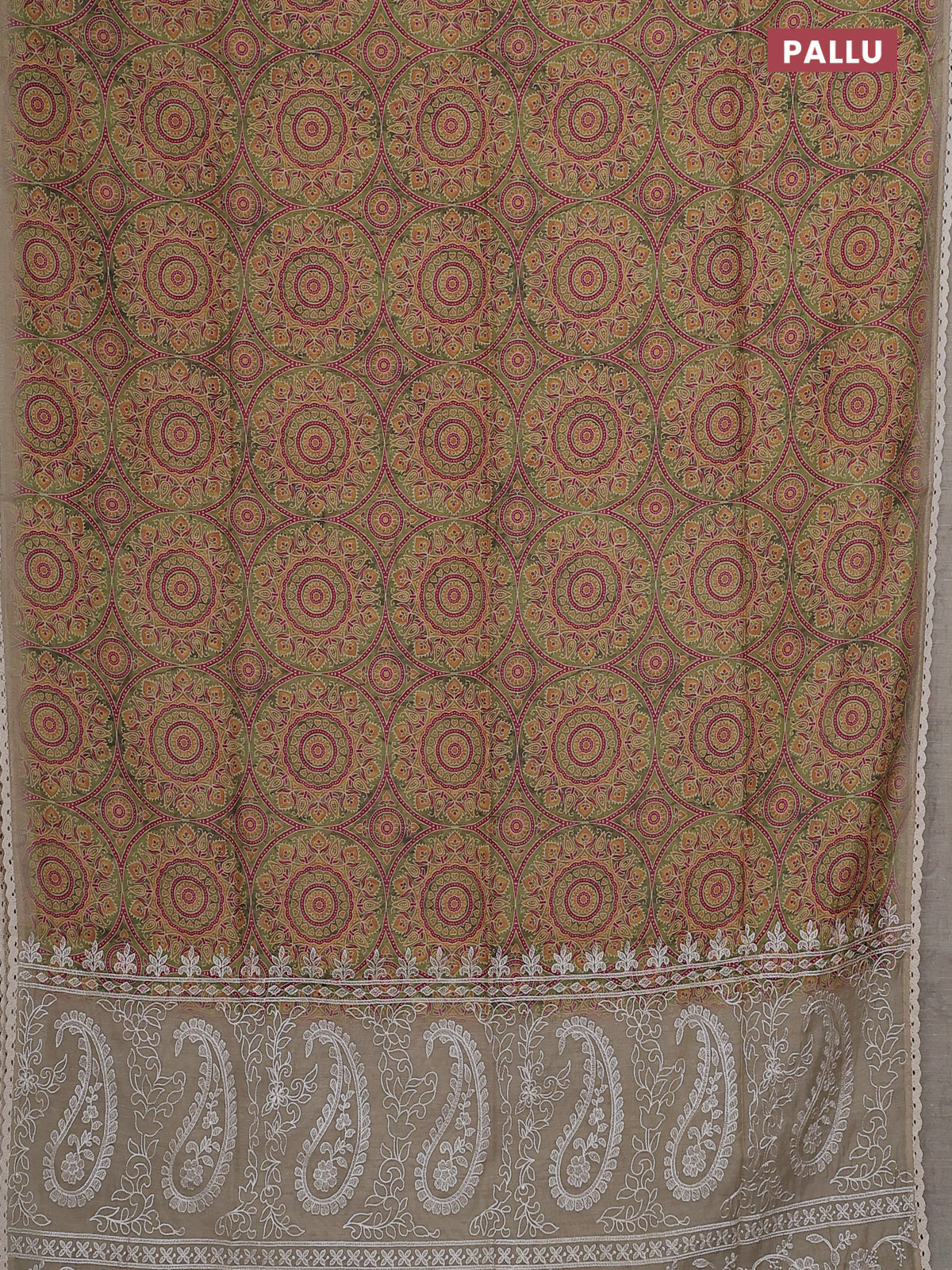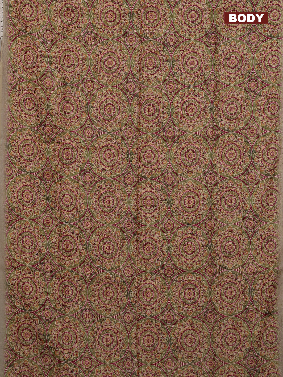 Semi chanderi saree mehendi green and beige with allover ajrakh prints and embroidery pallu