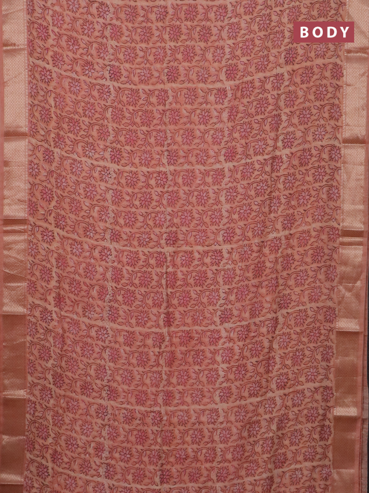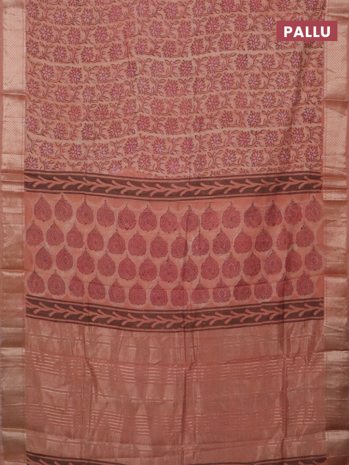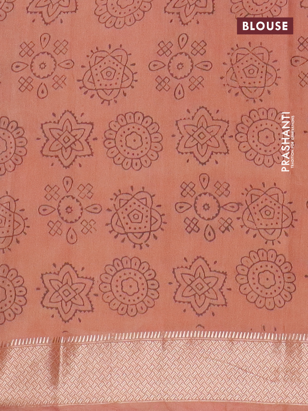 Semi chanderi saree peach orange with allover vanaspathi prints and zari woven border
