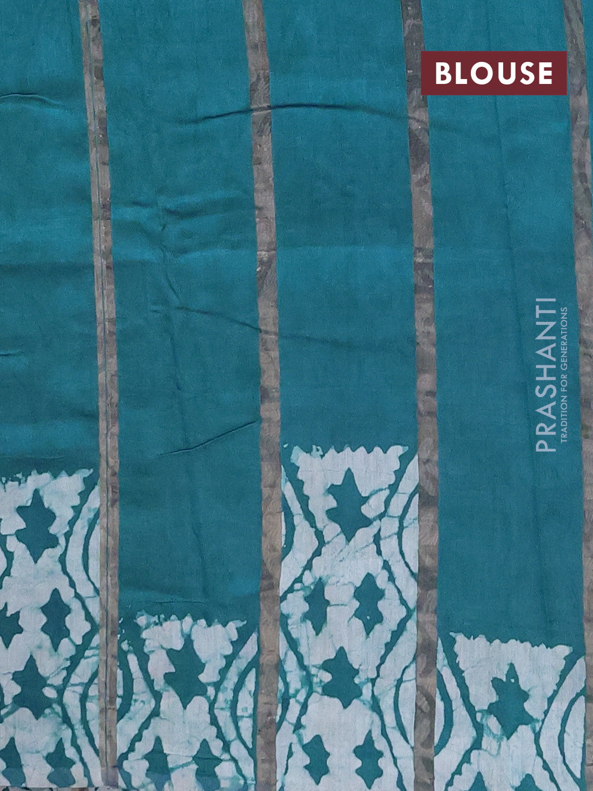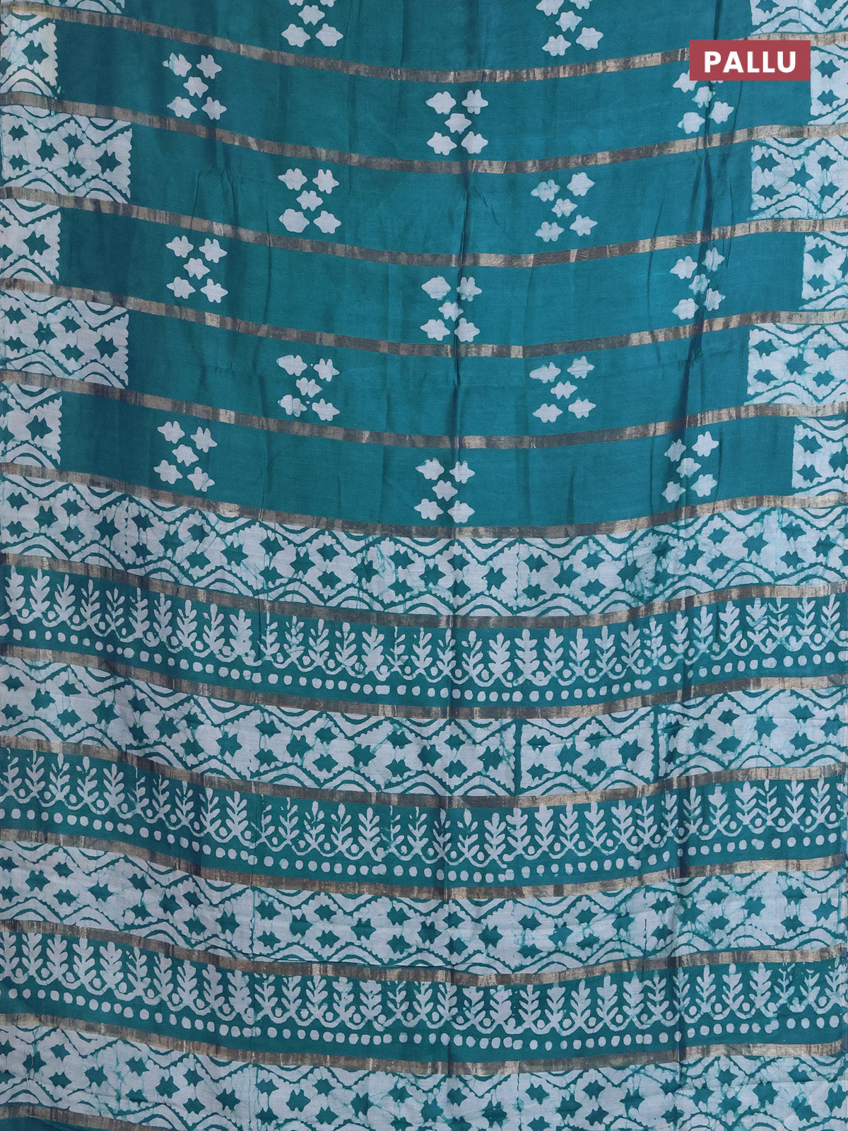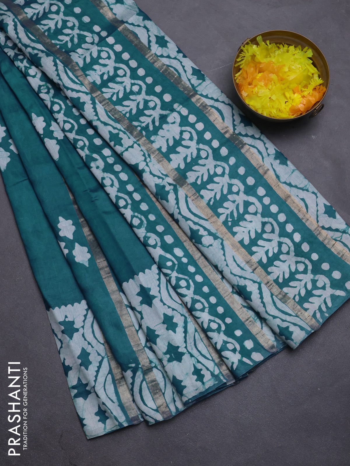 Semi chanderi saree peacock green with allover zari strips & batik butta prints in borderless style