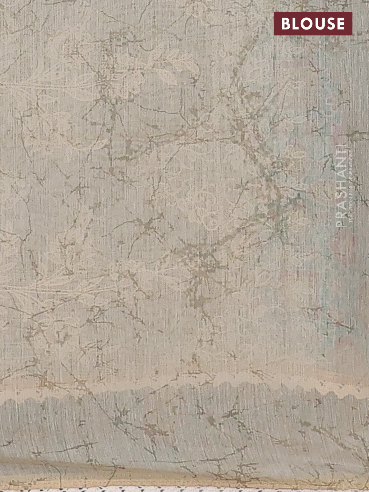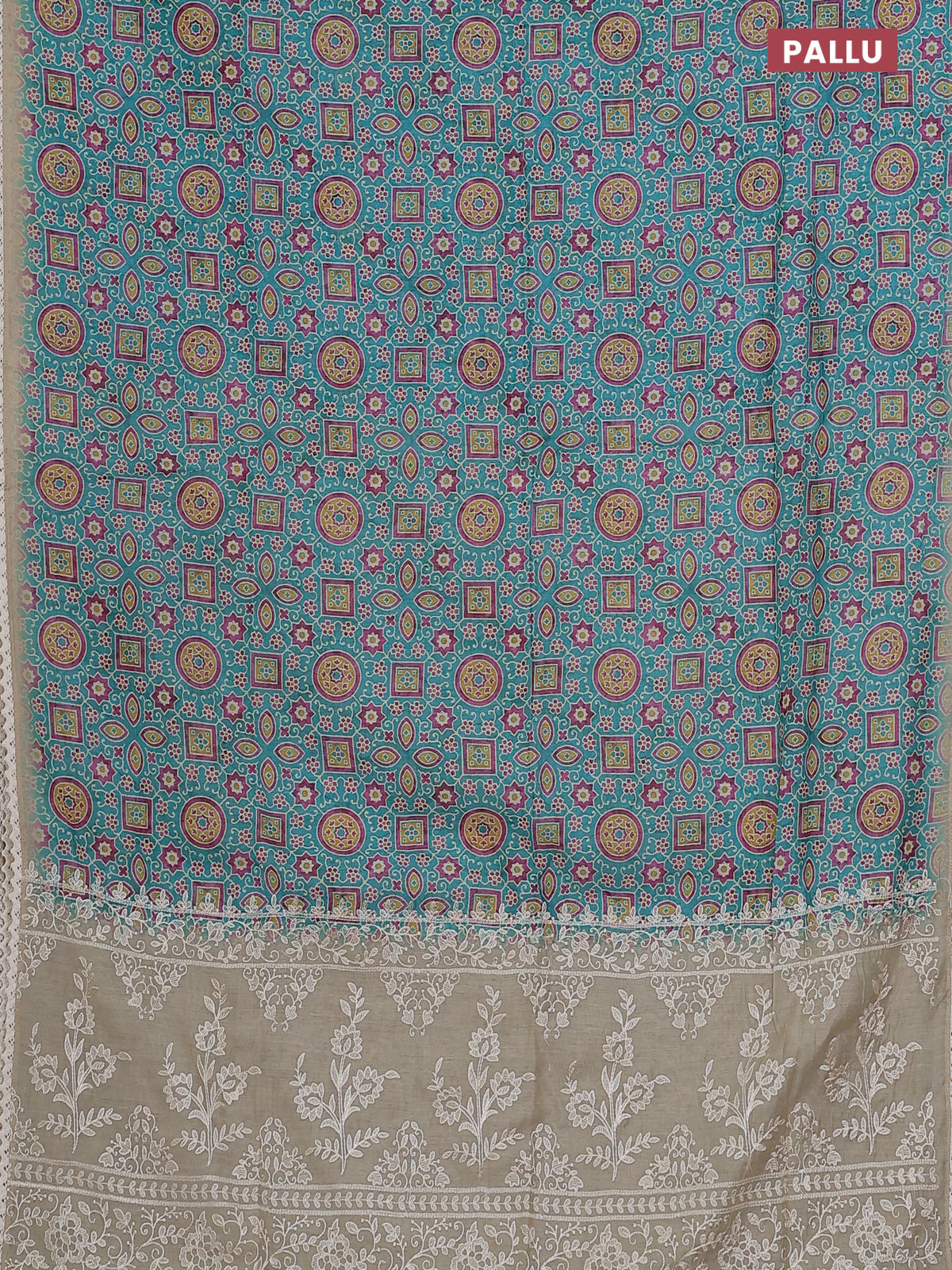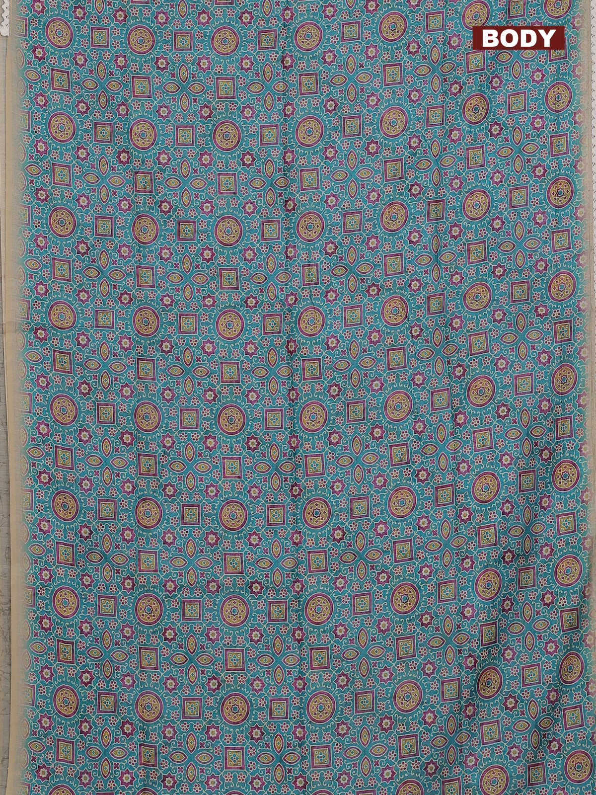 Semi chanderi saree teal blue and beige with allover ajrakh prints and embroidery pallu