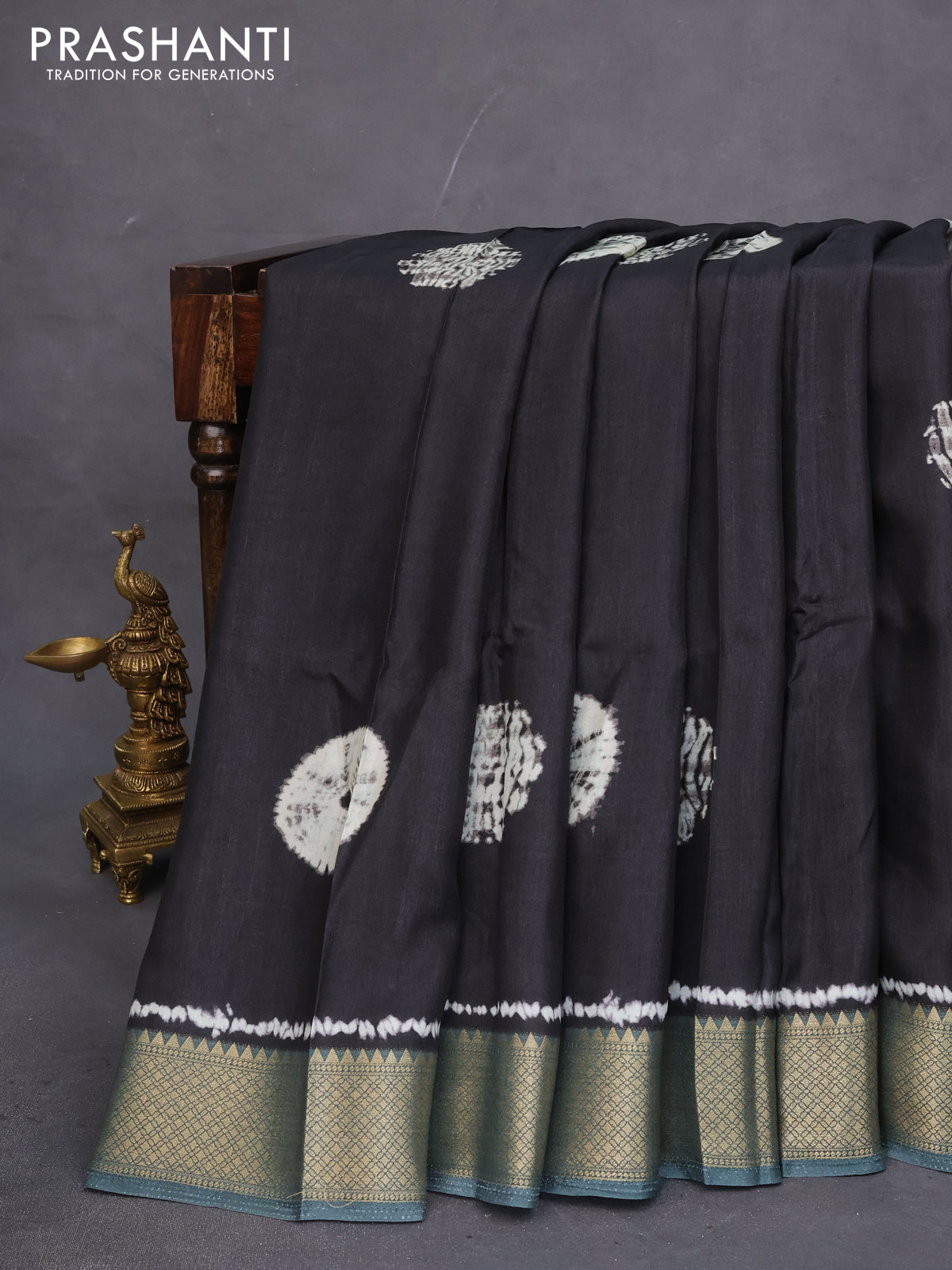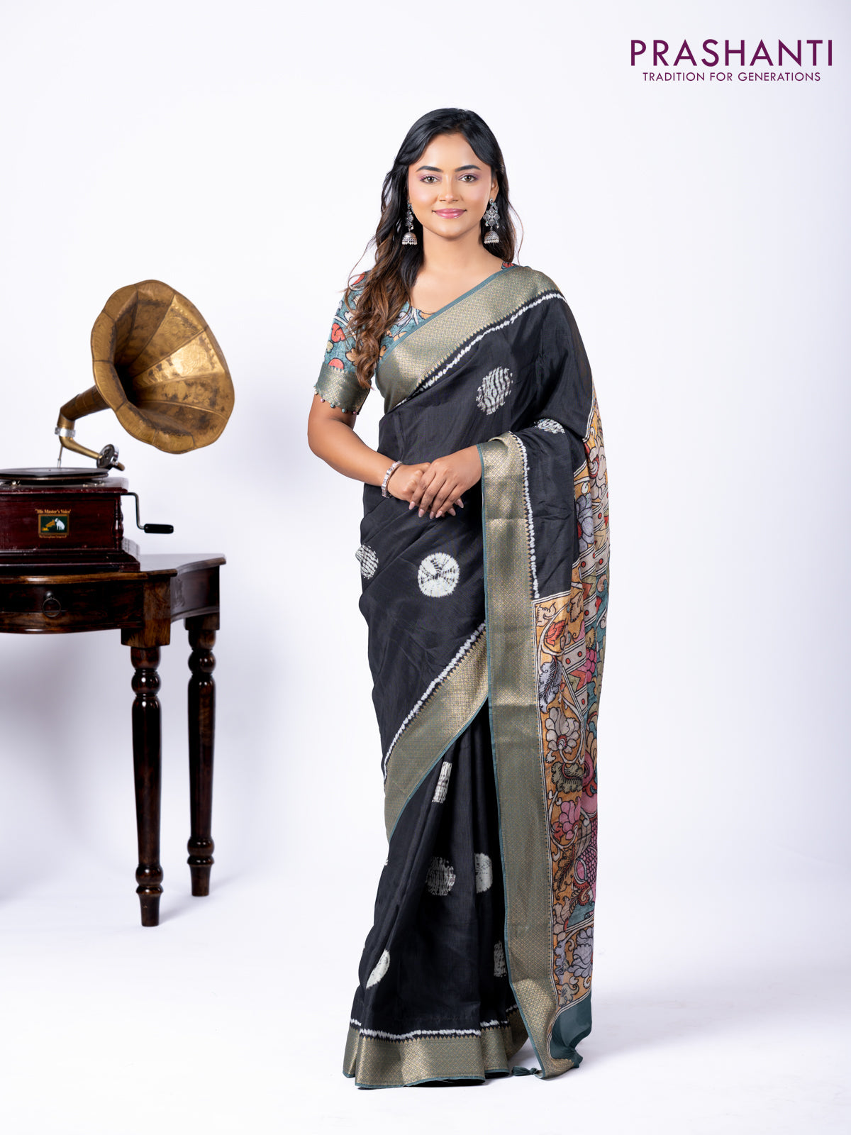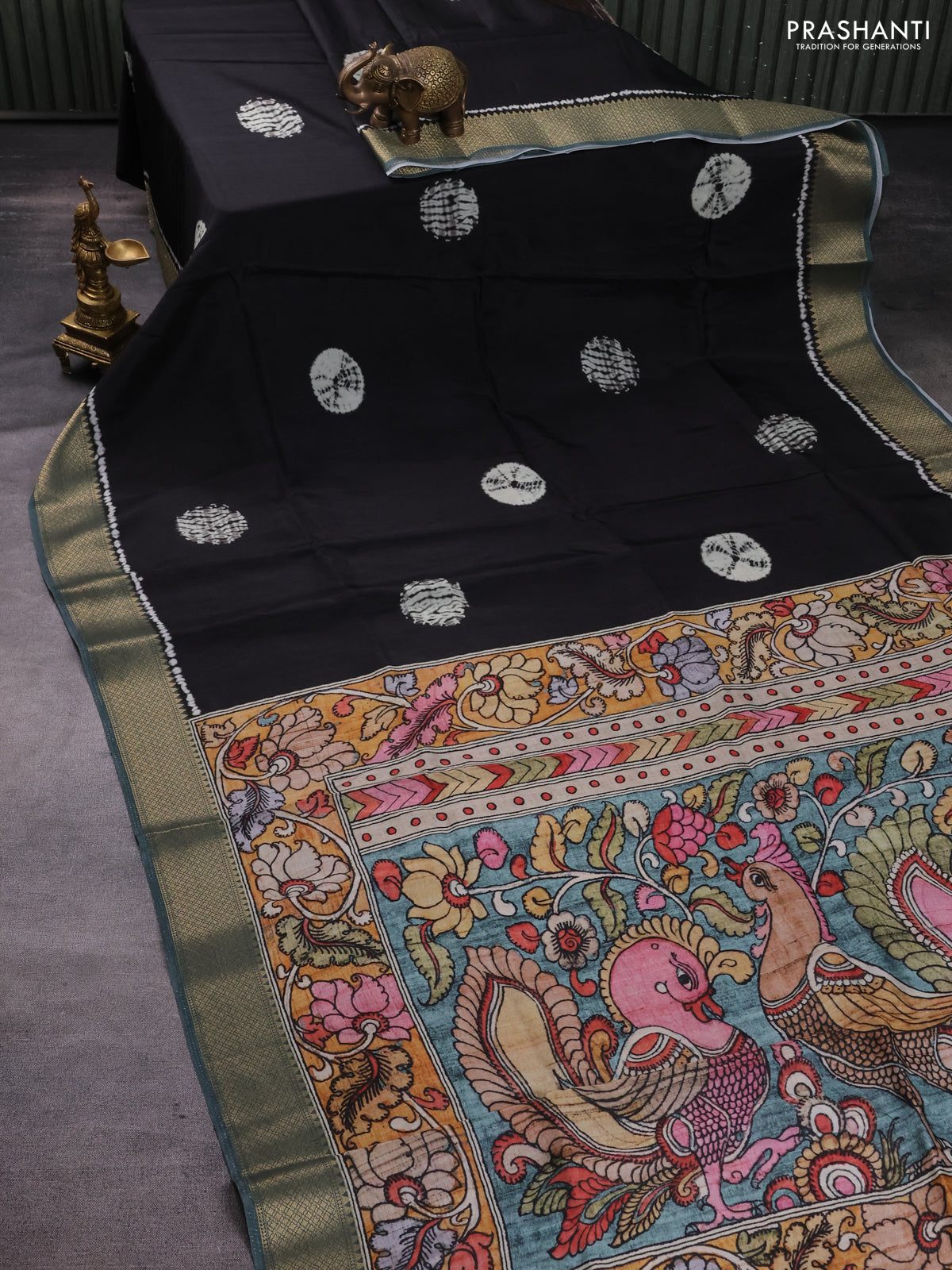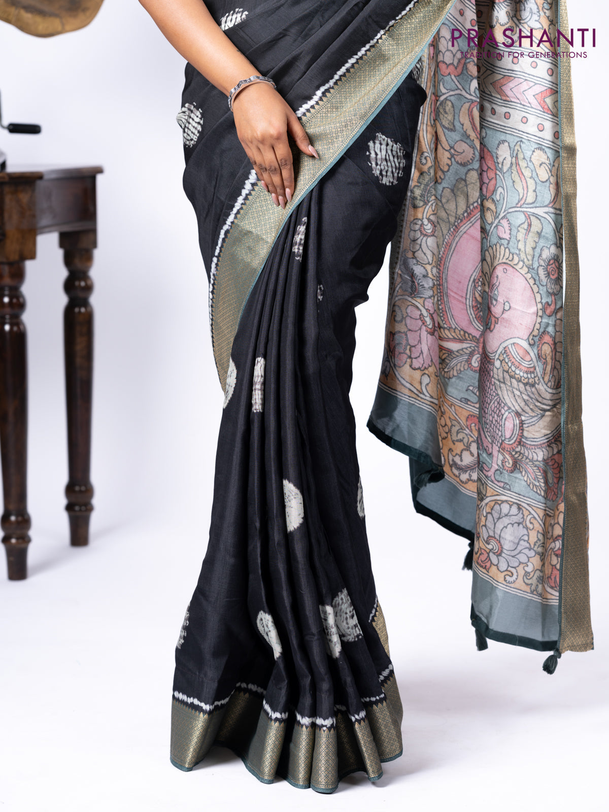 Semi crepe saree black and greyish green with shibori butta prints and kalamkari printed pallu & zari border