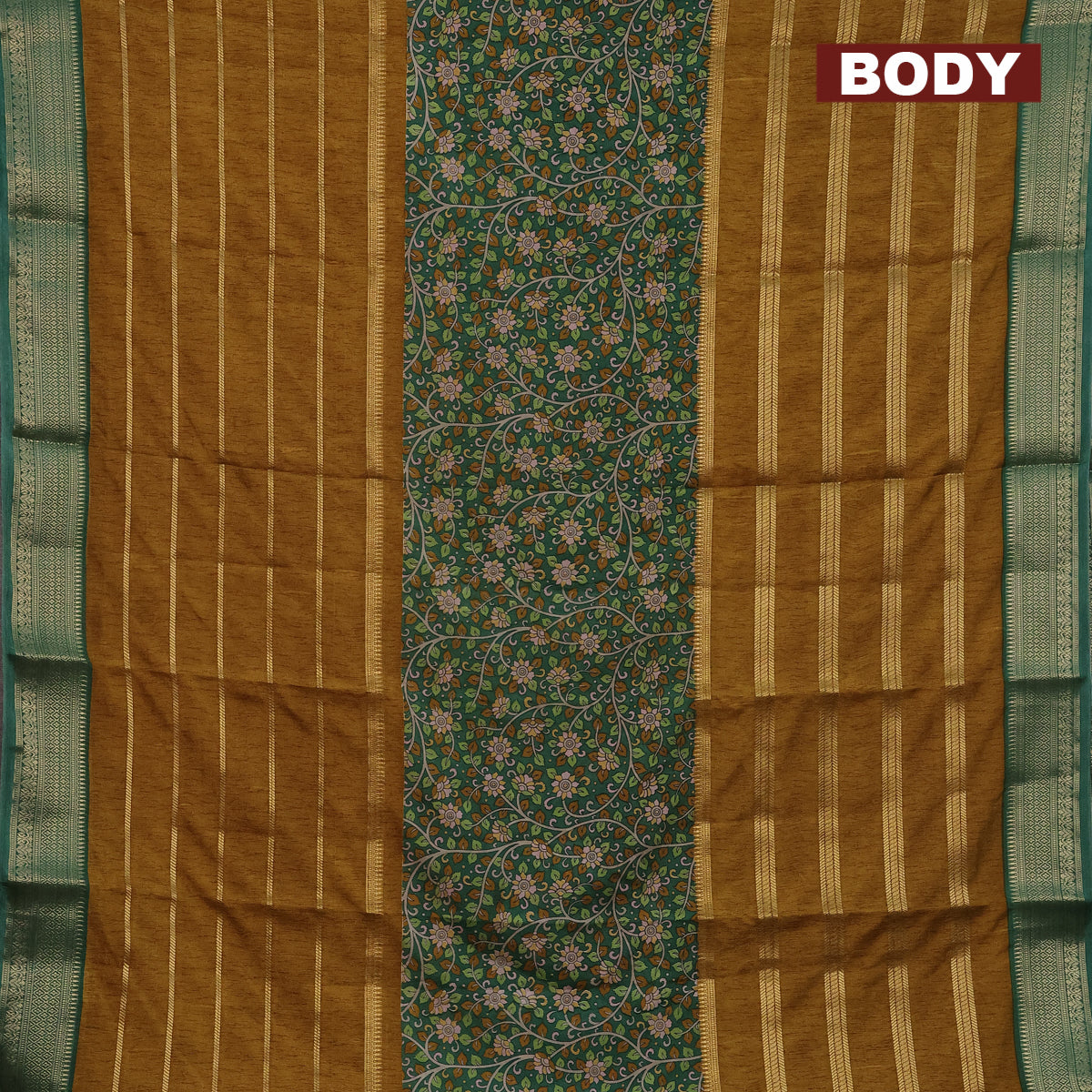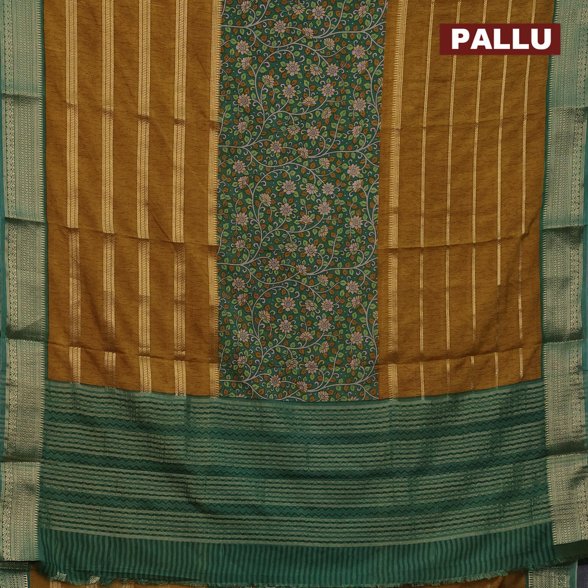 Semi crepe saree green and mustard shade with kalamkari prints and long zari woven simple border