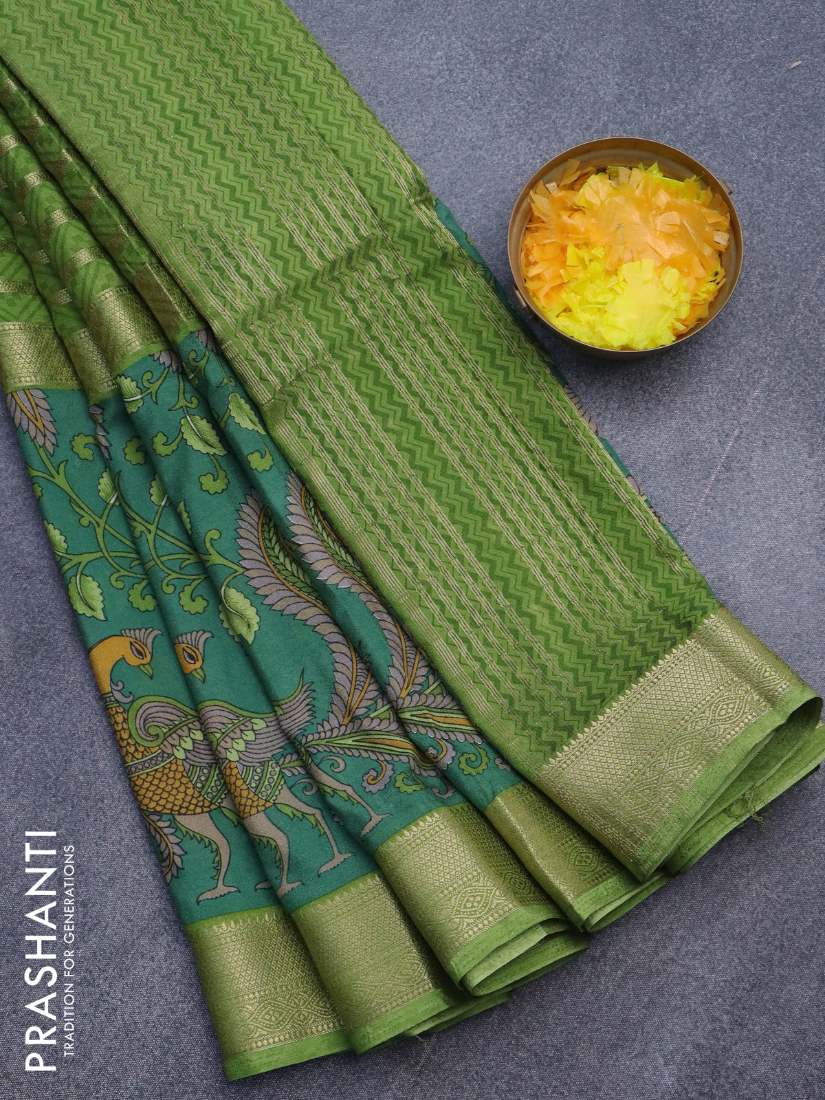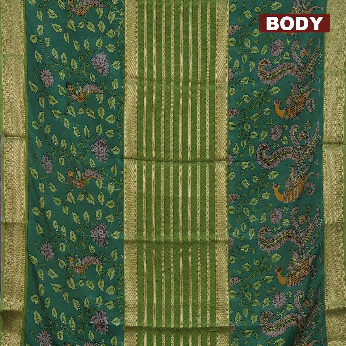 Semi crepe saree light green and green with zari weaves and long kalamkari printed zari border