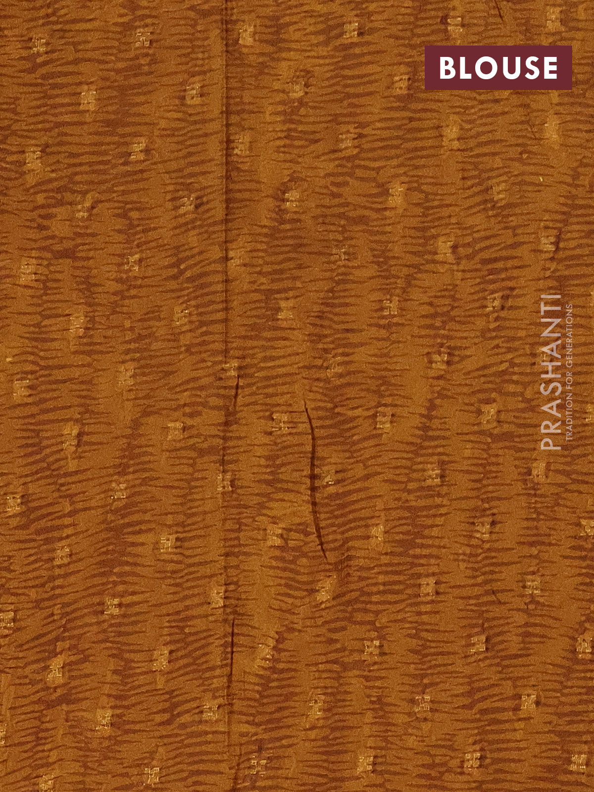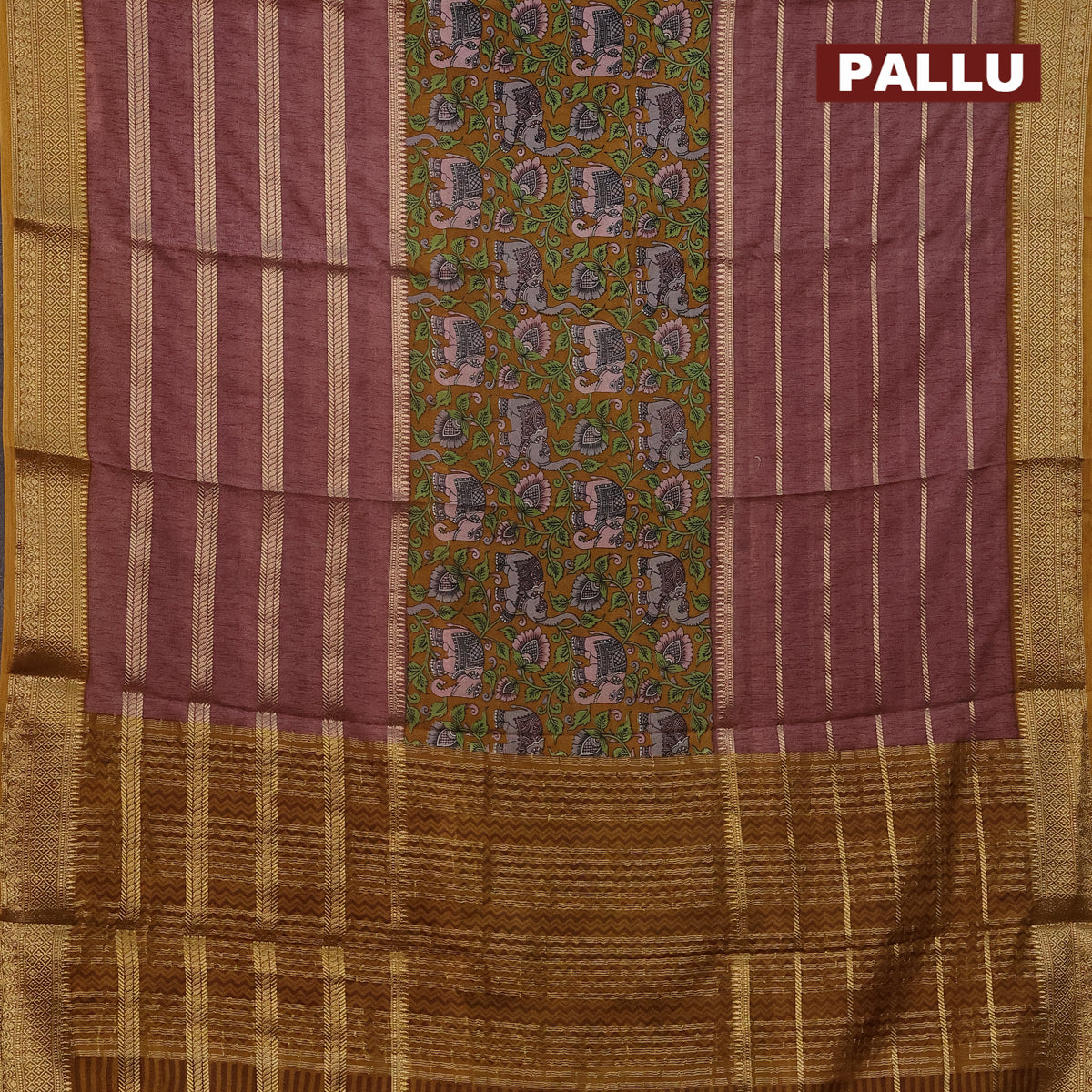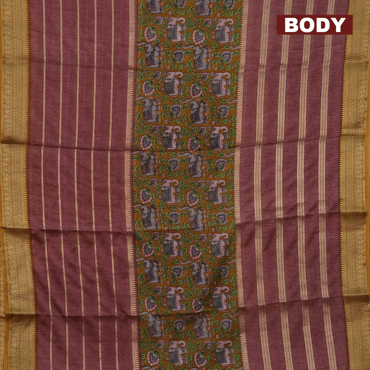 Semi crepe saree mustard shade and brown shade with kalamkari prints and long zari woven simple border